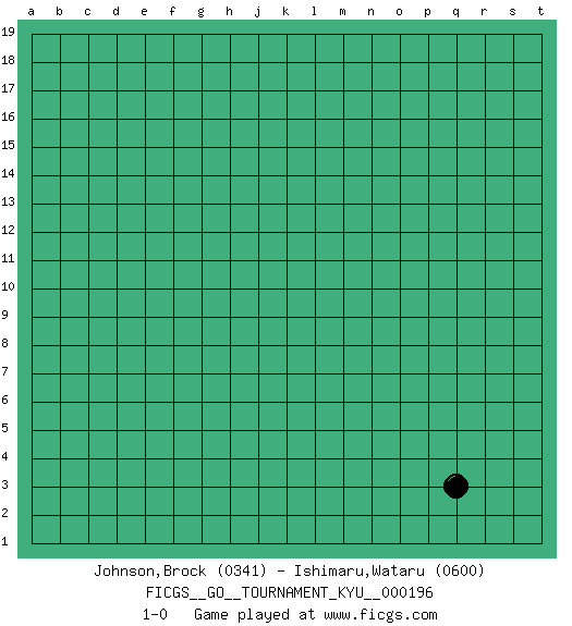 Last move : 1-0 2019 September 4 13:5:27 [Event "FICGS__GO__TOURNAMENT_KYU__000196"] [Site "FICGS"] [Date "2019.07.07"] [Round "1"] [Black "Johnson,Brock"] [White "Ishimaru,Wataru"] [Result "1-0"] [Rating 1 "0341"] [Rating 2 "0600"] 1.q3 1-0 This go game has been lost on time (started : 2019.07.07 0:28:22) Here are the names of the openings (joseki) played in the four corners : Corner q4 : q3 1-0 Komoku (Somok, Xiao~mu`) 3-4 Point. The komoku (3-4) point is the traditional corner enclosure move.. Player Black won this Go (weiqi, baduk) game. Follow this game move after move (download)Avoid the plate connection. (Anonymous) Bobby never cared about money, though. His only desire was to prove that his choices were correct: He wanted chess to be important because he was a chess player, and he wanted to be important. Bobby knew money was important, but he didn't have a clue why, outside of clothes and status. The only way he could accomplish what he wanted was to fight for a lot of money. Once he got it, he gave it away. He did not know how to spend it. And once he'd become champion, after, essentially, sacrificing his life for it, he didn't know how to spend his time. (Bob Wade)