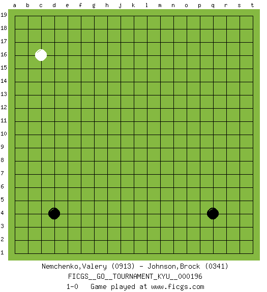 Last move : 1-0 2019 August 8 3:26:31 [Event "FICGS__GO__TOURNAMENT_KYU__000196"] [Site "FICGS"] [Date "2019.07.07"] [Round "1"] [Black "Nemchenko,Valery"] [White "Johnson,Brock"] [Result "1-0"] [Rating 1 "0913"] [Rating 2 "0341"] 1.q4 c16 2.d4 1-0 This go game has been lost on time (started : 2019.07.07 0:28:22) Here are the names of the openings (joseki) played in the four corners : Corner d4 : d4 1-0 Hoshi (Hwajeom, Seongjeom, Xingwei`) 4-4 Point. The star or hoshi (4-4) point, emphasizing influence at the potential expense of territory. Player Black won this Go (weiqi, baduk) game. Follow this game move after move (download)Learning josekis by heart is useless if you don't try departing from them. (Pierre Audouard) The message for business people contemplating their place in the cyberspace is simple and direct: get linked or get lost. (Vic Sussman and Kenan Pollack)