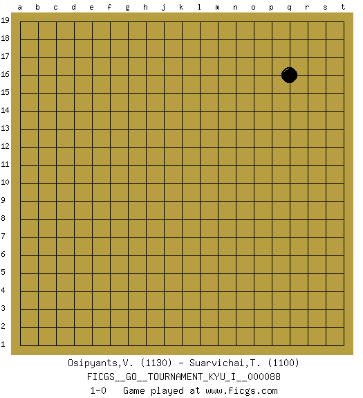 Last move : 1-0 2019 August 7 14:57:9 [Event "FICGS__GO__TOURNAMENT_KYU_I__000088"] [Site "FICGS"] [Date "2019.07.07"] [Round "1"] [Black "Osipyants,Vladimir"] [White "Suarvichai,Tanat"] [Result "1-0"] [Rating 1 "1130"] [Rating 2 "1100"] 1.q16 1-0 This go game has been lost on time (started : 2019.07.07 22:54:57) Here are the names of the openings (joseki) played in the four corners : Player Black won this Go (weiqi, baduk) game. Follow this game move after move (download)Don't try to enclose an open skirt. (Anonymous) But they are useless. They can only give you answers. (Pablo Picasso, about computers)