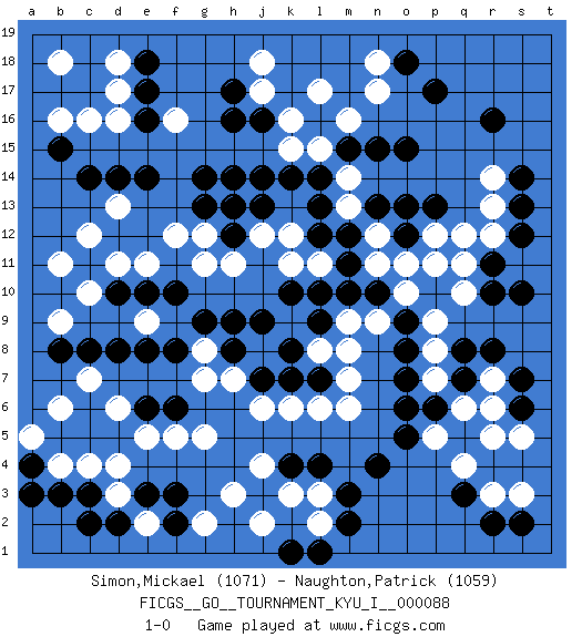Last move : 1-0 2019 August 13 23:24:8 [Event "FICGS__GO__TOURNAMENT_KYU_I__000088"] [Site "FICGS"] [Date "2019.07.07"] [Round "1"] [Black "Simon,Mickael"] [White "Naughton,Patrick"] [Result "1-0"] [Rating 1 "1071"] [Rating 2 "1059"] 1.r16 d4 2.q3 d16 3.p17 q10 4.q5 r13 5.f3 d6 6.k4 k16 7.c14 c16 8.c8 c7 9.d8 c12 10.e14 d13 11.d14 f16 12.r8 n17 13.o15 f12 14.g14 h13 15.h16 j17 16.j16 k15 17.j14 k12 18.k14 m14 19.l13 n12 20.l12 k11 21.h17 j18 22.m11 n9 23.h14 l11 24.m12 n11 25.m10 m9 26.n10 o10 27.l10 k9 28.n13 m13 29.o13 p11 30.m15 m16 31.n15 l15 32.l14 l17 33.f8 e9 34.e8 g5 35.f6 f5 36.j7 h7 37.h8 j8 38.h9 j6 39.k7 g7 40.k10 g8 41.e6 e5 42.d10 c10 43.g9 k6 44.l7 l6 45.l9 m6 46.n4 h3 47.c3 d3 48.d2 e2 49.c2 c4 50.e3 g2 51.f2 l3 52.l4 k3 53.m3 j4 54.o9 p9 55.o8 p12 56.o12 o11 57.g13 g12 58.p13 p8 59.o7 p7 60.o6 r7 61.s7 r6 62.s6 r5 63.s10 s5 64.s12 r12 65.s13 r14 66.s14 d11 67.e10 e11 68.f10 b11 69.h12 h11 70.j13 j12 71.h13 g11 72.e18 d18 73.e17 d17 74.e16 b18 75.b3 b4 76.a4 a5 77.a3 b6 78.b8 b9 79.r11 q11 80.o18 n18 81.m2 l2 82.l1 j2 83.k1 r3 84.r2 s3 85.s2 m7 86.j9 l8 87.k8 m8 88.b15 b16 89.r10 p5 90.p6 q4 91.q7 q6 92.q8 q12 93.o5 1-0 Here are the names of the openings (joseki) played in the four corners : Corner d4 : d4 f3 Hoshi (Hwajeom, Seongjeom, Xingwei`) 4-4 Point. The star or hoshi (4-4) point, emphasizing influence at the potential expense of territory. Ikken Kakari (Hankan Keolch'im, Yi Gua`jiao~, 1-Space Low Approach). Black 2 is the standard approach move to the 4-4. Corner d16 : d16 c14 Hoshi (Hwajeom, Seongjeom, Xingwei`) 4-4 Point. The star or hoshi (4-4) point, emphasizing influence at the potential expense of territory. Ikken Kakari (Hankan Keolch'im, Yi Gua`jiao~, 1-Space Low Approach). Black 2 is the standard approach move to the 4-4. Player Black won this Go (weiqi, baduk) game. Follow this game move after move (download)Win the early ko to win the game. (Anonymous) Life is the sum of all your choices. (Albert Camus)