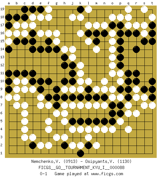 Last move : 0-1 2019 September 11 14:52:58 [Event "FICGS__GO__TOURNAMENT_KYU_I__000088"] [Site "FICGS"] [Date "2019.07.07"] [Round "1"] [Black "Nemchenko,Valery"] [White "Osipyants,Vladimir"] [Result "0-1"] [Rating 1 "0913"] [Rating 2 "1130"] 1.d4 q4 2.q16 c16 3.d14 e16 4.e14 c9 5.e10 c6 6.d6 c5 7.d5 c4 8.d7 c7 9.d8 d9 10.e9 k4 11.j5 j4 12.h4 h3 13.g4 g3 14.f3 f2 15.e3 e2 16.k5 l4 17.l5 o4 18.m5 j9 19.o5 p5 20.n5 m4 21.p6 q6 22.p7 q7 23.q8 r8 24.q9 r9 25.r10 m9 26.d10 c10 27.d11 k16 28.r11 r17 29.r16 q17 30.p17 p18 31.o17 o18 32.n18 s16 33.s15 s17 34.t16 s19 35.r14 g15 36.f14 j14 37.g14 h14 38.h13 j13 39.h12 k11 40.j12 k12 41.j11 k10 42.j10 h9 43.h10 n17 44.n16 m17 45.m18 l17 46.l18 k18 47.k19 j18 48.m16 o13 49.p13 o16 50.p16 o15 51.p15 o14 52.p14 o12 53.p12 p8 54.p9 o8 55.o7 n7 56.o6 o9 57.o10 n10 58.n8 n9 59.m8 m7 60.l8 l7 61.k8 k7 62.j8 j7 63.h8 h7 64.g8 h5 65.g5 h6 66.g7 k9 67.l9 l10 68.g9 p10 69.q10 p11 70.q11 o11 71.c15 b16 72.d16 d17 73.d15 f16 74.f15 g16 75.c11 b10 76.b11 d3 77.d2 c3 78.c8 b8 79.a10 b9 80.a9 b7 81.b15 g6 82.f6 n4 83.r7 r6 84.t17 t18 85.t15 f5 86.e4 f4 87.e5 s7 88.s9 s8 89.t10 f7 90.e6 e8 91.f8 e7 92.f10 a8 93.a11 a15 94.a14 a16 95.t8 t7 96.t9 c17 97.o19 q18 98.p19 q19 99.n19 l19 100.m19 l19 101.l16 l15 102.m15 m14 103.j3 pass 104.k3 l3 105.l2 m2 106.k1 j2 107.h2 k2 108.b18 pass 109.c18 d18 110.d19 e18 111.e19 f19 112.c19 f18 113.a17 b17 114.a18 pass 0-1 Here are the names of the openings (joseki) played in the four corners : Corner d16 : c16 d14 Komoku (Somok, Xiao~mu`) 3-4 Point. The komoku (3-4) point is the traditional corner enclosure move.. Corner d4 : d4 c9 Hoshi (Hwajeom, Seongjeom, Xingwei`) 4-4 Point. The star or hoshi (4-4) point, emphasizing influence at the potential expense of territory. Player White won this Go (weiqi, baduk) game. Follow this game move after move (download)Don't reduce your own liberties. (Bill Taylor) Internal peace cannot coexist with external war. (Don Groves)