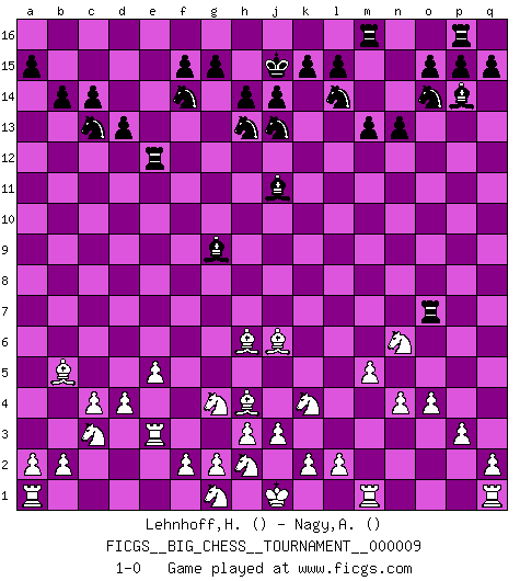 Last move : 1-0 2007 September 29 10:28:39 [Event "FICGS__BIG_CHESS__TOURNAMENT__000009"] [Site "FICGS"] [Date "2007.06.17"] [Round "1"] [White "Lehnhoff,Heinz-Georg"] [Black "Nagy,Attila"] [Result "1-0"] [WhiteElo ""] [BlackElo ""] 1.j2-k4 j15-h13 2.h1-o7 p16-o14 3.o7-l7 k16-l14 4.p1-o3 c15-c14 5.e2-e4 d15-d13 6.d2-d4 n15-n13 7.f1-b5 h16-m12 8.c1-e3 g16-f14 9.c2-c4 e15-e13 10.b1-c3 o16-j11 11.m2-m4 c16-j10 12.n2-n4 h15-j13 13.l1-o4 m15-m13 14.l7-b7 m12-b12 15.b7-e10 j10-g12 16.e10-p10 q16-p16 17.o1-j6 l16-o13 18.e4-e5 b12-g7 19.h2-g4 g12-k9 20.p10-b10 b15-b14 21.e3-h6 g7-o7 22.o4-e13 b16-d15 23.e13-p3 f16-c13 24.o3-n5 o7-l10 25.b10-l10 o13-l10 26.k1-h2 j16-j15 27.n5-l6 c13-g9 28.p3-l7 e16-e15 29.o2-o3 a16-e16 30.l6-m8 l10-p14 31.m8-k9 j11-m14 32.k9-m8 d15-c13 33.e1-e3 e15-e7 34.l7-h4 e7-p7 35.p2-p3 e16-e12 36.m4-m5 m14-j11 37.m8-n6 p7-o7 38.o3-o4 1-0 This big chess game has been lost on time (started : 2007.06.17 12:14:29) Follow this game move after move (download)The Pin is mightier than the sword. (Fred Reinfeld) Im Blitz ist es einfacher mit einer Figur weniger anzugreifen, als sich mit einer Mehrfigur zu verteidigen. (Mikhail Nekhemyevich Tal) El Ajedrez es un juego de pelea el cual es puramente intelectual e incluye la suerte. (Richard Reti) Les échecs sont un jeu par leur forme, un art par leur essence et une science par sa difficulté d'acquisition. Ils peuvent vous procurer autant de plaisir qu'un bon livre ou une belle musique, mais vous n'aurez une réelle joie que si vous arrivez à bien jouer. (Tigran Petrosian) The problem with manipulation is that people can turn on you. (Horatio Caine, C.S.I. Miami)