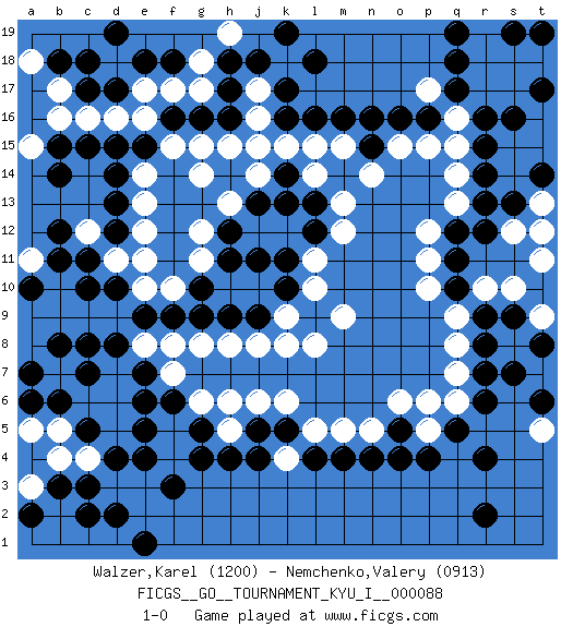 Last move : 1-0 2019 October 26 12:34:38 [Event "FICGS__GO__TOURNAMENT_KYU_I__000088"] [Site "FICGS"] [Date "2019.07.07"] [Round "1"] [Black "Walzer,Karel"] [White "Nemchenko,Valery"] [Result "1-0"] [Rating 1 "1200"] [Rating 2 "0913"] 1.d4 q16 2.r4 d16 3.p4 p6 4.l4 n5 5.k16 k15 6.l16 l15 7.o16 o15 8.p16 p15 9.f16 f15 10.g16 g15 11.d14 e14 12.d13 e13 13.d12 e12 14.d10 e10 15.h16 h15 16.e15 g14 17.c17 e16 18.d15 c16 19.d17 e17 20.e18 f17 21.f18 g17 22.h17 g18 23.h18 d18 24.c18 j16 25.k17 j17 26.j18 j15 27.n15 n14 28.m16 m15 29.n16 d11 30.c11 e11 31.c10 d9 32.c7 c9 33.c15 b16 34.b15 b17 35.b18 a18 36.d19 a15 37.b14 b10 38.b11 a9 39.b8 b9 40.e9 e8 41.f9 f8 42.g9 g8 43.h9 h8 44.j9 j8 45.d8 d7 46.c8 a8 47.a7 c12 48.b12 a11 49.a10 f10 50.h12 k9 51.k10 j10 52.j11 h10 53.g10 l10 54.k11 g11 55.h11 g12 56.l9 k8 57.q10 m9 58.g4 l8 59.r14 q14 60.r13 q13 61.q12 p12 62.r7 q7 63.r8 q8 64.r9 q9 65.r15 q15 66.q17 p10 67.q11 p11 68.r16 l11 69.l12 m12 70.l13 m13 71.e7 d6 72.e6 f7 73.f6 g6 74.g5 h6 75.n4 m5 76.m4 l5 77.k5 k6 78.j5 j6 79.o5 o6 80.q5 p5 81.o4 q6 82.r6 r10 83.r12 r17 84.q18 r18 85.s16 s17 86.s19 r19 87.q19 s18 88.t17 t18 89.t19 f5 90.e5 f4 91.f3 h5 92.h4 d5 93.e4 k4 94.j4 l14 95.k13 h13 96.j13 j14 97.k14 s10 98.s9 t9 99.pass s8 100.s7 t8 101.r2 t7 102.t6 t11 103.pass s12 104.s13 t13 105.t14 t12 106.pass t5 107.t10 t9 108.t8 c6 109.c3 c4 110.b3 b4 111.b6 b5 112.c5 a3 113.pass k18 114.l18 h19 115.k19 p17 116.pass a5 117.a6 b2 118.c2 c1 119.d2 d1 120.e1 b1 121.a2 a1 122.a2 1-0 Here are the names of the openings (joseki) played in the four corners : Corner q16 : q16 l16 Hoshi (Hwajeom, Seongjeom, Xingwei`) 4-4 Point. The star or hoshi (4-4) point, emphasizing influence at the potential expense of territory. Corner d16 : d16 f16 Hoshi (Hwajeom, Seongjeom, Xingwei`) 4-4 Point. The star or hoshi (4-4) point, emphasizing influence at the potential expense of territory. Ikken Takagakari (Hankan Nop'dakeolch'im, Yi Gaojia, 1-Space High Approach). White typically responds at 6-4 or 3-10. White 4-10 is played when White finds play on the right side advantageous. White 4-8 or 3-8 may be played when White has support at top. Corner d4 : d4 d9 Hoshi (Hwajeom, Seongjeom, Xingwei`) 4-4 Point. The star or hoshi (4-4) point, emphasizing influence at the potential expense of territory. Player Black won this Go (weiqi, baduk) game. Follow this game move after move (download)Keep sente in the opening. A premature attack loses sente. (Anonymous) All art requires courage. (Anne Tucker)