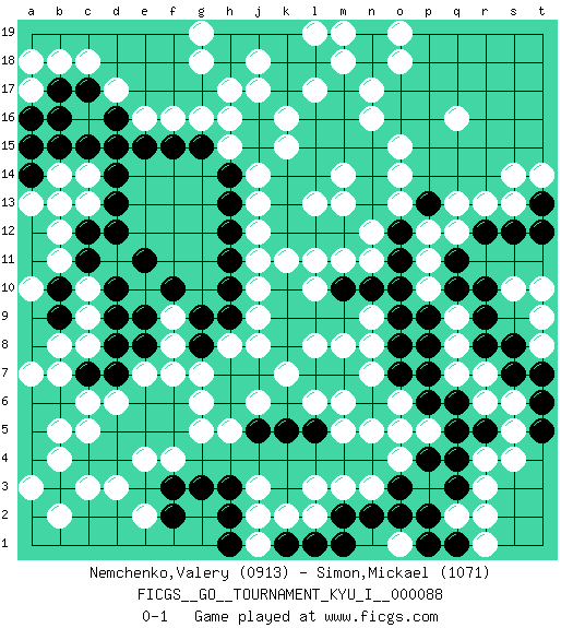 Last move : 0-1 2019 December 22 20:49:46 [Event "FICGS__GO__TOURNAMENT_KYU_I__000088"] [Site "FICGS"] [Date "2019.07.07"] [Round "1"] [Black "Nemchenko,Valery"] [White "Simon,Mickael"] [Result "0-1"] [Rating 1 "0913"] [Rating 2 "1071"] 1.d4 q16 2.q4 c16 3.d14 e16 4.e15 f16 5.f15 g16 6.g15 h16 7.j15 f4 8.f5 g5 9.f6 e4 10.e5 d3 11.c4 c3 12.b3 b2 13.a4 r6 14.q6 q7 15.p6 r4 16.r5 s5 17.q5 s6 18.p7 q8 19.p8 q9 20.p9 p10 21.o10 p11 22.o11 p12 23.o12 o13 24.n13 o14 25.n14 o15 26.n15 n16 27.m16 n17 28.j16 j17 29.k17 j18 30.k18 h15 31.h14 j14 32.k14 j13 33.h13 j12 34.h12 j11 35.h11 j10 36.h10 j9 37.h9 h8 38.g8 g7 39.f7 g6 40.h7 j8 41.j7 k7 42.h6 h5 43.j5 j6 44.m17 c10 45.c11 b11 46.d10 c9 47.d9 c8 48.d8 b5 49.a5 b4 50.b6 c5 51.d5 c6 52.c7 a3 53.a6 b7 54.d7 a7 55.c12 b12 56.b13 d6 57.e6 c13 58.d13 c14 59.c15 b14 60.b15 a13 61.a15 f8 62.g9 e7 63.e8 f9 64.f10 r3 65.q3 q2 66.p2 r2 67.q1 r1 68.p1 d11 69.d12 e10 70.e11 f7 71.e9 j3 72.k13 n3 73.k5 m6 74.m7 l6 75.l5 m5 76.n6 n5 77.o5 o4 78.p4 n7 79.l7 m8 80.k12 m11 81.m12 l11 82.l12 n11 83.n10 o6 84.o7 p5 85.o3 o5 86.n2 m3 87.m2 l2 88.l1 k2 89.k1 j1 90.m1 n9 91.o9 n12 92.n18 o1 93.o2 o18 94.m19 o19 95.n19 l19 96.k19 m18 97.l18 m19 98.j19 g18 99.h19 g19 100.h18 h17 101.d16 d17 102.d15 k16 103.l16 k15 104.l15 m14 105.l14 m13 106.m15 k11 107.c17 c18 108.b16 b18 109.b17 a17 110.a16 a18 111.a14 b13 112.b10 a10 113.b9 b8 114.o8 n8 115.m10 l8 116.h1 j2 117.h2 pass 118.h3 l3 119.g3 l17 120.p13 l13 121.f3 e2 122.f2 pass 123.q10 q13 124.r10 r7 125.q11 q12 126.r9 pass 127.r12 r13 128.s12 s13 129.t13 t14 130.t12 s14 131.r8 t10 132.s8 t8 133.t7 t9 134.s7 s4 135.t6 s10 136.t5 l10 0-1 Here are the names of the openings (joseki) played in the four corners : Corner d16 : c16 d14 Komoku (Somok, Xiao~mu`) 3-4 Point. The komoku (3-4) point is the traditional corner enclosure move.. Corner d4 : d4 f4 Hoshi (Hwajeom, Seongjeom, Xingwei`) 4-4 Point. The star or hoshi (4-4) point, emphasizing influence at the potential expense of territory. Ikken Takagakari (Hankan Nop'dakeolch'im, Yi Gaojia, 1-Space High Approach). Black typically responds at 6-4 or 3-10. Black 4-10 is played when Black finds play on the right side advantageous. Black 4-8 or 3-8 may be played when Black has support at top. Corner q4 : q4 r6 Hoshi (Hwajeom, Seongjeom, Xingwei`) 4-4 Point. The star or hoshi (4-4) point, emphasizing influence at the potential expense of territory. Ikken Kakari (Hankan Keolch'im, Yi Gua`jiao~, 1-Space Low Approach). White 2 is the standard approach move to the 4-4. Player White won this Go (weiqi, baduk) game. Follow this game move after move (download)With less than 15 stones in danger, tenuki. (Anonymous) First of all, we have to go back to the classical time control. (Anatoly Karpov)