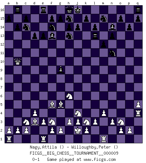 Last move : 0-1 2007 October 1 22:52:41 [Event "FICGS__BIG_CHESS__TOURNAMENT__000009"] [Site "FICGS"] [Date "2007.06.17"] [Round "1"] [White "Nagy,Attila"] [Black "Willoughby,Peter"] [Result "0-1"] [WhiteElo ""] [BlackElo ""] 1.j2-h4 j15-h13 2.h1-o7 p16-o14 3.b1-c3 e15-e13 4.g1-f3 d15-d13 5.p1-o3 f16-c13 6.n2-n3 n15-n13 7.d2-d4 m15-m13 8.c1-g5 k16-l14 9.m2-m4 b16-c14 10.e2-e3 g16-f14 11.l1-m2 h15-k14 12.f1-d3 c16-f13 13.o1-h7 l16-n14 14.h2-j4 o16-d6 15.j1-j2 m13-m12 16.k1-h2 l14-j13 17.o7-p6 c13-g9 18.m2-h6 p15-p14 19.h2-k3 k14-h15 20.q2-q4 m16-m14 21.p6-p13 o14-m15 22.h4-f5 d6-f8 23.q4-q5 f8-h6 24.f5-h6 m14-m13 25.h7-n12 m13-l13 26.l2-l3 j13-l12 27.p13-p10 l15-l14 28.n12-f5 l12-n11 29.p10-b10 a16-b16 30.q1-q4 b15-b14 0-1 This big chess game has been lost on time (started : 2007.06.17 12:14:29) Follow this game move after move (download)You sit at the board and suddenly your heart leaps. Your hand trembles to pick up the piece and move it. But what Chess teaches you is that you must sit there calmly and think about whether it's really a good idea and whether there are other better ideas. (Stanley Kubrick) Alle Schachspieler sollten auch ein Hobby haben. (Savielly Grigorievitsch Tartakower) Cuando tu casa esta en llamas, no puedes ser molestado por tus vecinos. O, como decinos en Ajedrez, si tu Rey esta bajo ataque, no te preocupa perder un Peón del lado de la Reina. (Gary Kasparov) Les sacrifices démontrent seulement que quelqu'un a gaffé. (Savielly Tartacover) Man with more than one clock never knows what time it is. (Chinese thought)