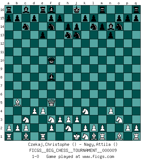 Last move : 1-0 2007 September 30 22:43:59 [Event "FICGS__BIG_CHESS__TOURNAMENT__000009"] [Site "FICGS"] [Date "2007.06.17"] [Round "1"] [White "Czekaj,Christophe"] [Black "Nagy,Attila"] [Result "1-0"] [WhiteElo ""] [BlackElo ""] 1.j2-k4 j15-h13 2.h1-o7 p16-o14 3.o7-c7 h15-j13 4.c7-c15 h16-o10 5.g2-g3 o10-o2 6.p1-o3 o2-f10 7.g1-f3 b16-c14 8.c15-l7 k16-l14 9.b1-c3 g16-f14 10.e2-e4 n15-n13 11.f1-b5 o16-h10 12.l7-g7 m15-m14 13.d2-d4 e15-e13 14.n2-n4 h10-f8 15.g7-f7 l16-n14 16.f7-f5 1-0 This big chess game has been lost on time (started : 2007.06.17 12:14:29) Follow this game move after move (download)In Chess, as it is played by masters, chance is practically eliminated. (Emanuel Lasker) Ich war zu klein für die Schach-Schülermannschaft! (Woody Allen) El estómago es una parte esencial del maestro de Ajedrez. (Bent Larsen) Vous savez, camarade Pachman, je n'éprouve pas de plaisir à être ministre, je jouerais plutôt aux échecs comme vous, ou alors ferais une révolution au Venezuela. (Che Guevara à Ludek Pachman, 'Checkmate in Prague', 1975) Looking at the proliferation of personal web pages on the Net, it looks like very soon everyone on Earth will have 15 megabytes of fame. (M.G. Sriram)