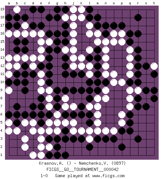 Last move : 1-0 2019 December 10 15:29:45 [Event "FICGS__GO__TOURNAMENT__000042"] [Site "FICGS"] [Date "2019.07.11"] [Round "1"] [Black "Krasnov,Aleksandr"] [White "Nemchenko,Valery"] [Result "1-0"] [Rating 2 "0897"] 1.q16 d4 2.q4 d16 3.q10 o10 4.o3 n4 5.o17 o15 6.m3 m4 7.n3 o4 8.p4 p5 9.q6 p6 10.q5 q7 11.r7 q8 12.r8 q9 13.r10 p10 14.h4 l3 15.k3 k4 16.j3 j4 17.l2 l4 18.h3 h5 19.d3 e3 20.d2 g4 21.f3 f4 22.g3 e2 23.e1 f2 24.g2 g1 25.f1 d1 26.h1 c2 27.f1 e1 28.g1 c3 29.e17 e16 30.d17 c17 31.c18 b16 32.b17 c16 33.a18 a16 34.a17 f17 35.f18 g17 36.g18 h18 37.h19 j19 38.g19 j17 39.r18 p15 40.q15 q14 41.r14 q13 42.r13 q12 43.r12 q11 44.r11 r9 45.s9 o16 46.c9 e9 47.e5 e6 48.h16 j16 49.d7 d5 50.d6 f5 51.e8 f8 52.f6 g6 53.e7 f7 54.e6 e4 55.g7 h7 56.g8 f9 57.g9 h8 58.f10 e10 59.h9 g10 60.f11 g11 61.f12 g12 62.g14 g13 63.f13 h14 64.h15 j15 65.h17 j18 66.h13 j14 67.f16 f15 68.g16 e14 69.f14 e13 70.d11 e11 71.e12 d12 72.g15 e15 73.h12 h10 74.j9 j10 75.k9 k10 76.l10 l11 77.m9 m10 78.l9 n9 79.k11 k12 80.j11 j12 81.h11 j13 82.m11 l12 83.n10 n11 84.m10 o11 85.m17 m16 86.n16 n15 87.n17 l16 88.m12 n12 89.m13 n13 90.m14 m15 91.c12 d13 92.c14 c13 93.b11 b12 94.c11 a13 95.b5 c5 96.c6 b6 97.b7 b4 98.a6 a4 99.r3 n8 100.b14 b13 101.c15 a11 102.a10 a12 103.c10 a9 104.b10 e18 105.e19 n14 106.b15 d18 107.d19 l14 108.l13 k13 109.p17 p16 110.r16 l17 111.l18 k18 112.l19 k19 113.m18 a5 114.b6 b19 115.b18 s8 116.s7 s10 117.t8 s11 118.s12 t10 119.t9 t12 120.t11 m8 121.l8 l7 122.k7 j7 123.l6 m7 124.j6 j5 125.k6 m6 126.h6 g5 127.l5 m5 128.p2 1-0 Here are the names of the openings (joseki) played in the four corners : Corner d4 : d4 h4 Hoshi (Hwajeom, Seongjeom, Xingwei`) 4-4 Point. The star or hoshi (4-4) point, emphasizing influence at the potential expense of territory. Corner d16 : d16 e17 Hoshi (Hwajeom, Seongjeom, Xingwei`) 4-4 Point. The star or hoshi (4-4) point, emphasizing influence at the potential expense of territory. Player Black won this Go (weiqi, baduk) game. Follow this game move after move (download)Take the cutting stone on the second line. (Anonymous) Happy endings are just stories that haven't finished yet. (Jane Smith in Mr & Mrs Smith)