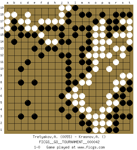 Last move : 1-0 2019 September 19 20:10:29 [Event "FICGS__GO__TOURNAMENT__000042"] [Site "FICGS"] [Date "2019.07.11"] [Round "1"] [Black "Tretyakov,Andrey"] [White "Krasnov,Aleksandr"] [Result "1-0"] [Rating 1 "0055"] 1.q16 d16 2.d5 q4 3.e3 f17 4.d11 o3 5.k3 q10 6.k5 p16 7.q17 p17 8.p18 p15 9.q15 p14 10.q13 q14 11.r14 p12 12.n18 q12 13.r12 r11 14.k11 p13 15.o17 r13 16.k17 s12 17.c16 c17 18.c15 r15 19.s14 s15 20.s16 t16 21.r16 t14 22.t15 s15 23.t13 s13 24.t15 k16 25.l16 t14 26.q3 r15 27.r4 p3 28.r3 p4 29.r6 q6 30.b17 d18 31.h16 k15 32.l15 l13 33.k14 r5 34.s5 q5 35.s6 r7 36.s7 r8 37.c3 b18 38.b16 d17 39.d15 f15 40.j15 q2 41.r2 p1 42.e13 g14 43.h13 h14 44.j14 j17 45.j16 h17 46.g16 g17 47.f16 e16 48.e15 s17 49.r18 l5 50.l6 m5 51.k18 j18 52.n15 l11 53.k10 m8 54.k8 l7 55.k7 m6 56.n13 n12 57.m12 l12 58.n11 o12 59.m11 l10 60.m13 l9 61.k9 k6 62.j6 l6 63.r17 t17 64.m3 n4 65.l4 o10 66.c8 m4 67.j4 k13 68.j12 j13 69.g13 o16 70.n16 l14 71.s18 m14 72.n14 a17 73.t18 t15 74.r1 m15 75.m16 k19 76.l19 j19 77.n10 n9 78.l8 a16 79.a15 a18 80.k12 s8 81.m9 m10 82.m9 n8 83.n2 o2 84.q1 p2 85.n1 t7 86.t5 t6 87.t8 t9 88.t7 s9 89.f14 o11 90.c10 n3 91.m2 s4 92.s3 t4 93.t3 pass 94.e8 o15 95.m18 o14 96.b14 o13 97.f12 o1 98.pass pass 99.pass pass 100.pass pass 1-0 Here are the names of the openings (joseki) played in the four corners : Corner q16 : q16 p16 Hoshi (Hwajeom, Seongjeom, Xingwei`) 4-4 Point. The star or hoshi (4-4) point, emphasizing influence at the potential expense of territory. Player Black won this Go (weiqi, baduk) game. Follow this game move after move (download)Learning josekis by heart is useless if you don't try departing from them. (Pierre Audouard) Good decisions come from experience, and experience comes from bad decisions. (Anonymous)