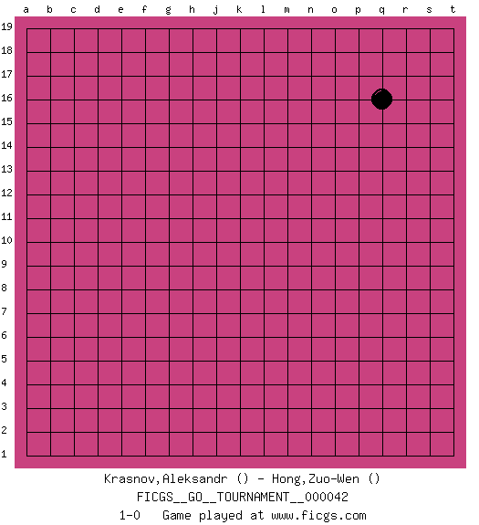Last move : 1-0 2019 August 10 21:45:52 [Event "FICGS__GO__TOURNAMENT__000042"] [Site "FICGS"] [Date "2019.07.11"] [Round "1"] [Black "Krasnov,Aleksandr"] [White "Hong,Zuo-Wen"] [Result "1-0"] 1.q16 1-0 This go game has been lost on time (started : 2019.07.11 12:8:41) Here are the names of the openings (joseki) played in the four corners : Player Black won this Go (weiqi, baduk) game. Follow this game move after move (download)Win the early ko to win the game. (Anonymous) I fear not the man who has practiced 10,000 kicks once, but I fear the man who has practiced one kick 10,000 times. (Bruce Lee)