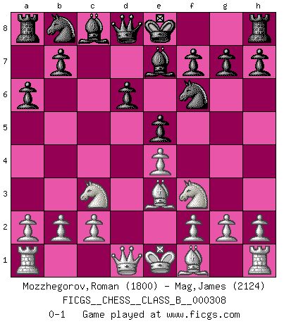 Last move : 0-1 2019 August 28 1:39:57 [Event "FICGS__CHESS__CLASS_B__000308"] [Site "FICGS"] [Date "2019.07.11"] [Round "1"] [White "Mozzhegorov,Roman"] [Black "Mag,James"] [Result "0-1"] [WhiteElo "1800"] [BlackElo "2124"] 1.e4 c5 2.Nf3 d6 3.d4 cxd4 4.Nxd4 Nf6 5.Nc3 a6 6.Be3 e5 7.Nf3 Be7 0-1 This chess game has been lost on time (started : 2019.07.11 20:10:56) Sicilian : Najdorf, Byrne (English) attack Player Black won this chess game. Follow this game move after move (download)Combinations have always been the most intriguing aspect of Chess. The masters look for them, the public applauds them, the critics praise them. It is because combinations are possible that Chess is more than a lifeless mathematical exercise. They are the poetry of the game; they are to Chess what melody is to music. They represent the triumph of mind over matter. (Reuben Fine) Sie führen leise Selbstgespräche, schlürfen lautstark ihre Getränke, schmatzen hörbar beim Essen, blasen ihrem Gegenüber Rauch in die Augen, niesen ihm ins Gesicht, starren ihn unverwandt an, bis er sich unter ihren Blicken windet, rutschen ständig auf ihrem Stuhl hin und her, rülpsen und bohren in der Nase. (Anonymous) Botvinnik trató de alejar el misterio referente al Ajedrez, siempre relacionandolo a situaciones de la vida diaria. Solía llamar al Ajedrez un problema inexacto típico, similar a aquellos en que la gente tiene siempre que resolver a cada día. (Garry Kasparov) Plusieurs personnes se sont demandées comment Tal faisait pour gagner... En fait, c'est très simple ! Il met ses pièces au centre de l'échiquier et les sacrifie quelque part ! (David Bronstein) Memory is a complicated thing, a relative to truth, but not its twin. (Barbara Kingsolver, Animal Dreams)