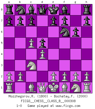 Last move : 1-0 2019 August 26 23:45:16 [Event "FICGS__CHESS__CLASS_B__000308"] [Site "FICGS"] [Date "2019.07.11"] [Round "1"] [White "Mozzhegorov,Roman"] [Black "Bochatay,Felipe"] [Result "1-0"] [WhiteElo "1800"] [BlackElo "2000"] 1.d4 Nf6 2.c4 g6 3.Nc3 d5 4.c5 1-0 This chess game has been lost on time (started : 2019.07.11 20:10:56) King's Indian defense, 3.Nc3 Player White won this chess game. Follow this game move after move (download)War is the child of passion, passion is the child of narcissism and narcissism is the child. (...) Another game ? (Thibault de Vassal) Meine Liebe ist Schach, Schach, Schach. Ich muss jeden Tag Schach spielen, deshalb fühle ich mich so stark. (Miguel Najdorf) Debemos de asegurarnos de que el Ajedrez no se convierta en un lenguaje muerto, muy interesante, pero solo para un grupo muy pequeño. (Sytze Faber) L'attaque fait le spectacle, la défense gagne les matchs. (Dicton footballistique) Luck never gives; it only lends. (Swedish proverb)