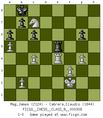 Last move : 1-0 2019 September 8 19:29:57 [Event "FICGS__CHESS__CLASS_B__000308"] [Site "FICGS"] [Date "2019.07.11"] [Round "1"] [White "Mag,James"] [Black "Cabrera,Claudio"] [Result "1-0"] [WhiteElo "2124"] [BlackElo "1844"] 1.e4 e5 2.Nf3 Nc6 3.Bb5 a6 4.Bxc6 dxc6 5.O-O Bg4 6.h3 h5 7.d3 Qf6 8.Nbd2 Ne7 9.Re1 Ng6 10.d4 Nf4 11.hxg4 hxg4 12.g3 gxf3 13.Qxf3 Ne6 14.dxe5 Qxe5 15.c3 g6 16.Nc4 Qb5 17.Qe2 O-O-O 18.Be3 c5 19.a4 Qe8 20.Qf3 Bg7 21.e5 Rh5 22.Na5 c6 23.g4 Ng5 24.Bxg5 Rxg5 25.e6 fxe6 26.Nc4 e5 27.Nb6+ Kc7 28.a5 Qf8 29.Kg2 Qf5 30.Re4 Kb8 31.Qe2 Ka7 32.f3 Qf8 33.Rd1 Bf6 34.Rxd8 Qxd8 35.Kg3 Bg7 36.Qc4 Bf8 37.Qf7 Qd1 38.Kf2 Qd2+ 39.Re2 Qd8 40.Qd7 Qxd7 41.Nxd7 Bd6 42.c4 Bc7 43.Nxc5 e4 44.Ne6 Re5 45.Nxc7 Kb8 46.Rxe4 1-0 Ruy Lopez : Exchange variation, Alapin gambit Kingside Castling by player White (move 5) Queenside Castling by player Black (move 17) Player White won this chess game. Follow this game move after move (download)Alekhine is a poet who creates a work of art out of something that would hardly inspire another man to send home a picture post card. (Max Euwe) Rauchen ist dem Schachspieler bei seiner Arbeit, also im Wettkampf, untersagt. (Viktor Kortschnoi) El Ajedrez lo es todo: arte, ciencia y deporte. (Anatoly Karpov) Dieu déplace le joueur, et celui-ci la pièce. Quel Dieu derrière Dieu commence donc la trame ? Arturo Perez-Reverte (prix de littérature policière 1993). A bird doesn't sing because it has an answer, it sings because it has a song. (Maya Angelou)