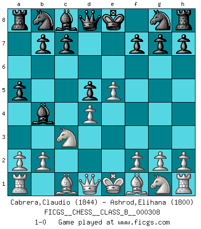 Last move : 1-0 2019 August 21 23:46:15 [Event "FICGS__CHESS__CLASS_B__000308"] [Site "FICGS"] [Date "2019.07.11"] [Round "1"] [White "Cabrera,Claudio"] [Black "Ashrod,Elihana"] [Result "1-0"] [WhiteElo "1844"] [BlackElo "1800"] 1.e4 a5 2.d4 e6 3.c4 d5 4.cxd5 exd5 5.e5 Bb4+ 6.Nc3 1-0 This chess game has been lost on time (started : 2019.07.11 20:10:56) Corn stalk defense Player White won this chess game. Follow this game move after move (download)The Chess pieces are the block alphabet which shapes thoughts; and these thoughts, although making a visual design on the chessboard, express their beauty abstractly, like a poem. (Marcel Duchamp) Karpov ist ein Museumsstück. (Garry Kasparov) ¡Examina movidas que hagan daño! Un buen ojo for movidas desvastantes es mucho mas importante que el conocimiento de principios estratégicos. (Purdy) La tactique, c'est ce que vous faites quand il y a quelque chose à faire; la stratégie, c'est ce que vous faites quand il n'y a rien à faire. (Savielli Tartacower) Chess, like love, like music, has the power to make people happy. (Siegbert Tarrasch)