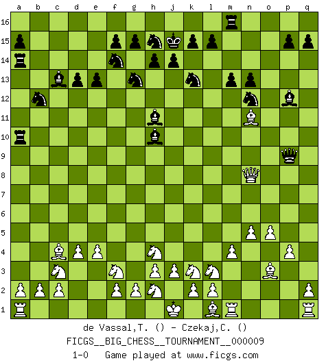 Last move : 1-0 2007 October 3 12:44:29 [Event "FICGS__BIG_CHESS__TOURNAMENT__000009"] [Site "FICGS"] [Date "2007.06.17"] [Round "1"] [White "de Vassal,Thibault"] [Black "Czekaj,Christophe"] [Result "1-0"] [WhiteElo ""] [BlackElo ""] 1.j2-h4 j15-k13 2.h1-o7 h15-g13 3.o7-o15 p16-o14 4.o15-c4 c15-c14 5.p1-o3 d15-d13 6.k1-l3 h16-o10 7.e2-e4 m15-m13 8.d2-d4 n15-n13 9.m2-m4 c16-j10 10.c4-c10 k16-h15 11.e1-e3 e15-e13 12.e3-b3 b15-b13 13.n2-n4 o10-j5 14.b3-b5 j5-j8 15.b1-c3 j10-h11 16.b5-n5 o16-m14 17.g1-f3 g16-f14 18.o3-m2 l16-p12 19.m2-k3 b16-a14 20.c10-c14 a14-b12 21.c14-b13 a16-b16 22.b13-a12 f16-c13 23.f1-c4 j16-j15 24.o1-n2 q16-o16 25.o2-o4 m14-h10 26.n5-j5 j8-p8 27.n2-o3 b16-b14 28.o4-o5 e16-e14 29.p2-p4 b14-a14 30.a12-d9 o14-n12 31.n4-n5 o16-o9 32.d9-e10 a14-a10 33.e10-g8 o9-o8 34.j5-j8 o8-j8 35.g8-j8 p8-p9 36.j8-n8 e14-a14 37.c1-n11 1-0 Follow this game move after move (download)It is not a move, even the best move that you must seek, but a realizable plan. (Eugene Znosko-Borovsky) Kasparov ist eine Art Monster mit hundert Augen, denen auch nicht das Geringste entgeht. (Tony Miles) Un buen jugador siempre tiene buena suerte. (José Raúl Capablanca) La menace est plus forte que l'exécution. (Aaron Nimzovitch) Humor is by far the most significant activity of the human brain. (Edward De Bono)