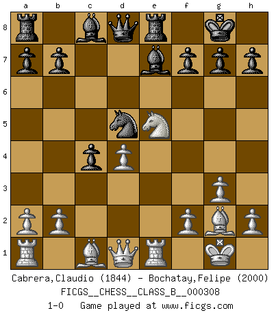 Last move : 1-0 2019 September 25 18:34:10 [Event "FICGS__CHESS__CLASS_B__000308"] [Site "FICGS"] [Date "2019.07.11"] [Round "1"] [White "Cabrera,Claudio"] [Black "Bochatay,Felipe"] [Result "1-0"] [WhiteElo "1844"] [BlackElo "2000"] 1.c4 c5 2.Nc3 Nf6 3.g3 Nc6 4.Bg2 e6 5.e4 d5 6.exd5 exd5 7.cxd5 Nb4 8.d3 Nbxd5 9.Nf3 Be7 10.O-O O-O 11.d4 c4 12.Re1 Re8 13.Nxd5 Nxd5 14.Ne5 1-0 English : Symmetrical variation Kingside Castling by player White (move 10) Kingside Castling by player Black (move 10) Player White won this chess game. Follow this game move after move (download)It is difficult to play against Einstein's theory --on his first loss to Fischer. (Mikhail Tal) Wenn man heute mit 14 Jahren noch kein GM ist, kann man es vergessen. (Viswanathan Anand) Bobby es la celebridad menos entendida y malinterpretada que camina el la faz de esta tierra. (Yasser Seirawan) Les sacrifices démontrent seulement que quelqu'un a gaffé. (Savielly Tartacover) A good player is always lucky. (Capablanca)