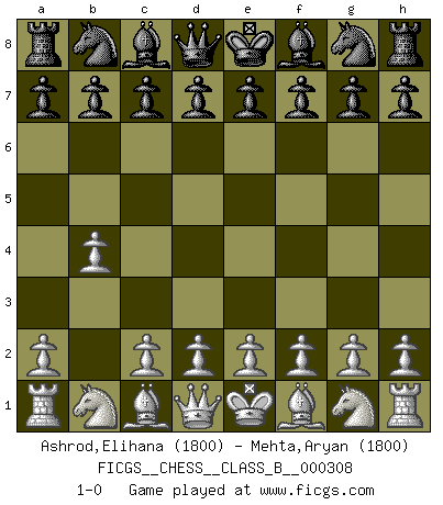 Last move : 1-0 2019 August 21 11:40:44 [Event "FICGS__CHESS__CLASS_B__000308"] [Site "FICGS"] [Date "2019.07.11"] [Round "1"] [White "Ashrod,Elihana"] [Black "Mehta,Aryan"] [Result "1-0"] [WhiteElo "1800"] [BlackElo "1800"] 1.b4 1-0 This chess game has been lost on time (started : 2019.07.11 20:10:56) Polish (Sokolsky) opening Player White won this chess game. Follow this game move after move (download)There's never before been a Chess player with such a thorough knowledge of the intricacies of the game and such an absolutely indomitable will to win. I think Bobby is the greatest player that ever lived. (Lisa Lane) Im Fernschach kannst du während dem Spiel rauchen. (John Christen Knudsen) Tu no necesitas jugar muy bien, únicamente ayudar a tu oponenet a que juegue muy mal. (Genrikh Chepukaitis) Il n'y a plus de joueurs du niveau de Jacob Murray dont la seule quête est le beau jeu, le plaisir de voir les pièces construire quelque chose. Sur 10 idées à la minute, 9 seront sans intérêt, la dernière s'avèrera géniale. (Christian Bauer) Fortune favours the audacious. (Desiderius Erasmus)