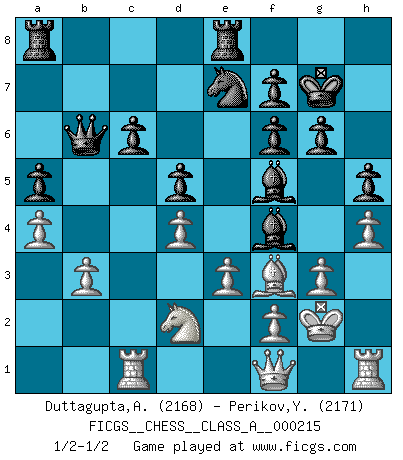 Last move : 1/2-1/2 2019 October 28 6:56:52 [Event "FICGS__CHESS__CLASS_A__000215"] [Site "FICGS"] [Date "2019.07.13"] [Round "1"] [White "Duttagupta,Aniruddha"] [Black "Perikov,Yuriy"] [Result "1/2-1/2"] [WhiteElo "2168"] [BlackElo "2171"] 1.d4 Nf6 2.Bg5 d5 3.Bxf6 exf6 4.e3 Nd7 5.g3 Bd6 6.Bg2 Nb6 7.Nd2 c6 8.Ne2 h5 9.b3 Be6 10.h4 O-O 11.Bf3 g6 12.a4 Kg7 13.O-O a5 14.Nf4 Bf5 15.Kg2 Re8 16.Rh1 Nc8 17.c4 Ne7 18.c5 Bb8 19.Qf1 b6 20.cxb6 Qxb6 21.Rc1 Bxf4 1/2-1/2 Trompowsky attack (Ruth, Opovcensky Opening) Kingside Castling by player Black (move 10) Kingside Castling by player White (move 13) This chess game ended in a draw. Follow this game move after move (download)I have added these principles to the law: get the Knights into action before both Bishops are developed. (Emanuel Lasker) Schach ist eine Sache der genauen Beurteilung, wann man zuschlagen und wann man sich ducken muss. (Robert James Fischer) No todos los artistas son jugadores de Ajedrez, pero todos los jugadores de Ajedrez son artistas. (Marcel Duchamp) Echiquier : carré parfait, comme la Jérusalem nouvelle décrite par l'auteur de l'Apocalypse, huit cases sur huit, exaltation du chiffre 4, symbole du cosmos aux quatre horizons... où le noir et le blanc, l'ombre et la lumière, le mal et le bien s'entremêlent et se conjuguent. (Robert Couffignal, Le Gambit du poète) For peace of mind, resign as general manager of the universe. (Douglas Adams)