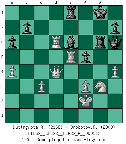 Last move : 1-0 2019 December 14 18:30:58 [Event "FICGS__CHESS__CLASS_A__000215"] [Site "FICGS"] [Date "2019.07.13"] [Round "1"] [White "Duttagupta,Aniruddha"] [Black "Drobotov,Gennady"] [Result "1-0"] [WhiteElo "2168"] [BlackElo "2000"] 1.e4 c5 2.Nf3 d6 3.d4 cxd4 4.Nxd4 Nf6 5.Nc3 e5 6.Bb5+ Nbd7 7.Nf5 a6 8.Bxd7+ Qxd7 9.Bg5 Nxe4 10.Nxg7+ Bxg7 11.Nxe4 O-O 12.Qxd6 f6 13.Be3 Qg4 14.Ng3 Qc4 15.f3 Rf7 16.Qd8+ Rf8 17.Qd3 Qb4+ 18.Kf2 f5 19.Qd5+ Rf7 20.Bc5 Qxb2 21.Qd8+ Bf8 22.Rhc1 e4 23.Bd4 Qb4 24.Qg5+ Bg7 25.c3 Qd6 26.Bxg7 Rxg7 27.Rd1 Qf8 28.Qf4 Be6 29.Rd6 Re8 30.Re1 Rg6 31.a4 exf3 32.gxf3 Qg7 33.Re5 Qf8 34.Qd4 Qh6 35.h4 1-0 Sicilian : Venice attack Kingside Castling by player Black (move 11) Player White won this chess game. Follow this game move after move (download)Chess is life. (Bobby Fischer) Ein Kibitz ist einer, der deinem Gegner gute Ratschläge gibt. (Andrew Soltis) Durante una competencia de Ajedrez, un Maestro de Ajedrez deberá ser una combinación de presa de caza y un Monge. (Alexander Alekhine) Nous vivons dans un monde échiquéen : chaque jour qui passe est un défi à relever. (Philosophe Sasha) I take risks, sometimes patients die, but not taking risks causes more patients to die. So I guess my biggest problem is I've been cursed with the ability to do the math. (Gregory House, House M.D.)