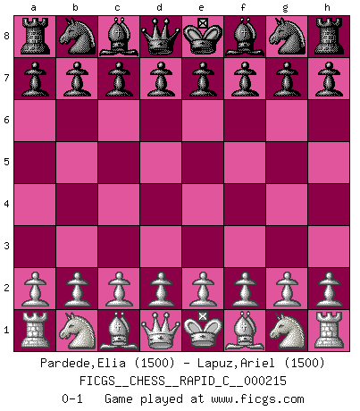 Last move : 0-1 2019 August 13 12:56:1 [Event "FICGS__CHESS__RAPID_C__000215"] [Site "FICGS"] [Date "2019.07.14"] [Round "1"] [White "Pardede,Elia"] [Black "Lapuz,Ariel"] [Result "0-1"] [WhiteElo "1500"] [BlackElo "1500"] 0-1 This chess game has been lost on time (started : 2019.07.14 1:37:41) Player Black won this chess game. Follow this game move after move (download)Chess is a cold bath for the mind. (Sir John Simon) Ein Isolani verdüstert die Stimmung auf dem ganzen Schachbrett. (Savielly Grigorievitsch Tartakower) No hay un Gran Maestro de Ajedrez que sea normal; solo se diferencían ellos por la magnitud de su locura. (Viktor Korchnoi) Le temps de noter son nom sur la feuille de partie, j'étais déjà en zeitnot ! D'un modeste amateur apparié lors de la première ronde d'un open contre le grand-maître Azmaïparashvili. Establishing goals is all right if you don't let them deprive you of interesting detours. (Doug Larson)