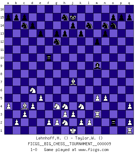 Last move : 1-0 2007 September 9 21:11:15 [Event "FICGS__BIG_CHESS__TOURNAMENT__000009"] [Site "FICGS"] [Date "2007.06.17"] [Round "1"] [White "Lehnhoff,Heinz-Georg"] [Black "Taylor,William"] [Result "1-0"] [WhiteElo ""] [BlackElo ""] 1.j2-k4 g15-g13 2.b1-c3 b16-c14 3.h1-o7 p16-o14 4.o7-f15 g16-f14 5.f15-l10 h14-h13 6.l10-l15 j15-l14 7.l15-f10 f16-j13 8.f10-n10 m15-m13 9.d2-d4 l16-p12 10.n10-n5 d15-d14 11.c1-n11 m13-m12 12.n11-k8 c16-l8 13.e2-e4 f14-g12 14.m2-m4 h16-b10 15.c3-b5 n15-n13 16.a2-a4 o16-h10 17.k8-h10 b10-h10 18.n5-h10 g12-h10 19.l1-o4 h10-k11 20.h2-g4 e15-e13 21.k1-h2 h15-f14 22.f1-c4 l8-m9 23.n2-n4 k16-h15 24.o1-g8 p12-n14 25.p1-o3 j13-l11 26.e4-e5 k11-l13 27.g8-n14 l13-n14 28.b5-d6 k15-k13 29.c2-c3 j16-j15 30.e1-e3 e16-f16 31.e3-f3 f14-g12 32.a1-e1 f16-f3 33.g1-f3 m16-f16 34.f3-h4 f16-f15 35.o4-k8 a16-f16 36.e1-e3 f15-f8 37.k8-h6 f8-p8 38.o3-q4 f16-f10 39.e3-f3 q16-f16 40.m1-m3 l11-k10 41.p2-p3 k10-q4 42.p3-q4 p8-p4 43.n4-n5 p4-p2 44.f3-f10 f16-f10 45.m4-m5 p2-o2 46.h6-j7 1-0 Follow this game move after move (download)For me, Chess is life and every game is like a new life. Every Chess player gets to live many lives in one lifetime. (Eduard Gufeld) Spielt Blackmar-Diemer-Gambit, und das Matt kommt von selbst! (Emil Joseph Diemer) El jugador blanco perdió porque fallo en recordar la coreccta continuación y tuvo que pensar por sí mismo las movidas. (Siegbert Tarrasch) Il n'y a pas eu de défaite parce que je ne crois pas que cet ordinateur ait jamais existé. IBM a triché en refusant d'imprimer les modes de recherche de la machine. C'est évident, pendant le match, des coups décisifs ont été joués par des êtres humains. Aujourd'hui, les meilleurs spécialistes en informatique ne peuvent toujours pas expliquer comment Deep-Blue a pu jouer contre la logique des ordinateurs. IBM a gagné une guerre de communication, mais ils sont incapables de prouver que l'ordinateur a gagné tout seul. (Garry Kasparov) You cannot beat a roulette table unless you steal money from it. (Albert Einstein)