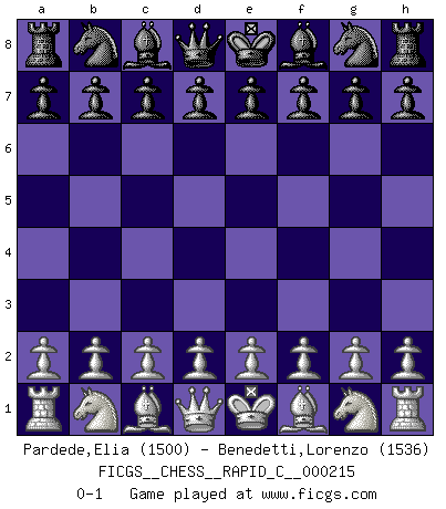 Last move : 0-1 2019 August 13 12:56:1 [Event "FICGS__CHESS__RAPID_C__000215"] [Site "FICGS"] [Date "2019.07.14"] [Round "1"] [White "Pardede,Elia"] [Black "Benedetti,Lorenzo"] [Result "0-1"] [WhiteElo "1500"] [BlackElo "1536"] 0-1 This chess game has been lost on time (started : 2019.07.14 1:37:41) Player Black won this chess game. Follow this game move after move (download)Chess is 99 percent tactics. (Teichmann) Das Schach ist nichts für kleine Geister, es beansprucht einen vollen Mann, der sich nicht sklavisch an das Überlieferte hält, sondern selbständig die Tiefen des Spiels zu ergründen sucht. (Wilhelm Steinitz) Realmente no sabemos como el juego fue inventado, aunque hay sospechas. Tan pronto como descubramos a los culpables, se los haremos saber. (Bruce Pandolfini) Le jeu d'échecs fait naître et fortifie en nous plusieurs qualités précieuses dans le cours de l'existence, telles que la prévoyance, la circonspection, la prudence, et la persévérance. (Benjamin Franklin - 1783, la morale des échecs) The best weapon against an enemy is another enemy. (Friedrich Nietzsche)