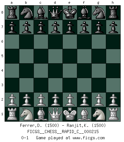 Last move : 0-1 2019 August 13 12:56:1 [Event "FICGS__CHESS__RAPID_C__000215"] [Site "FICGS"] [Date "2019.07.14"] [Round "1"] [White "Ferrer,Daniel Agustin"] [Black "Ranjit,Kick"] [Result "0-1"] [WhiteElo "1500"] [BlackElo "1500"] 0-1 This chess game has been lost on time (started : 2019.07.14 1:37:41) Player Black won this chess game. Follow this game move after move (download)In a gambit you give up a Pawn for the sake of getting a lost game. (Samuel Standige Boden) Wenn du auf das Glück wartest, wird das Leben ziemlich langweilig. (Mikhail Nekhemyevich Tal) El Ajedrez expande y enriquece tu mente. (Saudin Robovic) Les écrivains ont utilisé les échecs pour analyser les côtés extrêmes de la nature humaine. Dans ce cadre, les échecs offrent un champ d'expérimentation idéal. Mais on pourrait faire la même chose avec la peinture. Et là, en vous référant à Van Gogh, vous ne tirerez pas de conclusion définitive sur les peintres. (Gary Kasparov) Chess is as much a mystery as women. (Purdy)