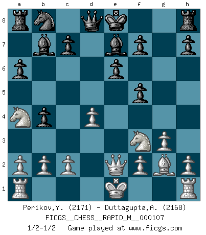 Last move : 1/2-1/2 2019 August 22 6:30:39 [Event "FICGS__CHESS__RAPID_M__000107"] [Site "FICGS"] [Date "2019.07.14"] [Round "1"] [White "Perikov,Yuriy"] [Black "Duttagupta,Aniruddha"] [Result "1/2-1/2"] [WhiteElo "2171"] [BlackElo "2168"] 1.e4 e6 2.d4 d5 3.Nc3 Nf6 4.Bg5 dxe4 5.Nxe4 Be7 6.Bxf6 gxf6 7.Nf3 f5 8.Nc3 a6 9.g3 b5 10.Bg2 Bb7 11.Qe2 b4 12.Na4 1/2-1/2 French : Burn variation This chess game ended in a draw. Follow this game move after move (download)Capture of the adverse King is the ultimate but not the first object of the game. (William Steinitz) Taktik ist was man tun muß, wenn etwas zu tun ist. Strategie ist was man tun muß, wenn nichts zu tun ist. (Savielly Grigorievitsch Tartakower) Tu cuerpo tiene que estar en óptima condición. Tu Ajedrez se deteriora como lo hace tu cuerpo. No puedes separar la mente y el cuerpo. (Bobby Fischer) Les ravages du H expliquent la différence de niveau entre Tal et Thal [Abergel]. Wisdom is the reward you get for a lifetime of listening when you'd have preferred to talk. (Doug Larson)