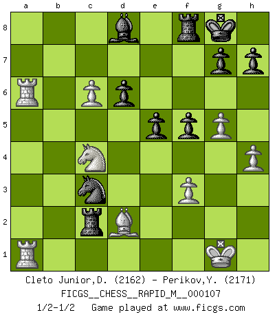 Last move : 1/2-1/2 2019 July 29 17:20:23 [Event "FICGS__CHESS__RAPID_M__000107"] [Site "FICGS"] [Date "2019.07.14"] [Round "1"] [White "Cleto Junior,Dirceu"] [Black "Perikov,Yuriy"] [Result "1/2-1/2"] [WhiteElo "2162"] [BlackElo "2171"] 1.e4 c5 2.Nf3 d6 3.d4 cxd4 4.Nxd4 Nf6 5.Nc3 a6 6.Be3 e5 7.Nb3 Be6 8.f3 Nbd7 9.g4 b5 10.g5 b4 11.Nd5 Nxd5 12.exd5 Bf5 13.Bd3 Bxd3 14.Qxd3 Be7 15.h4 a5 16.a3 bxa3 17.Rxa3 O-O 18.Qb5 Qc7 19.O-O Bd8 20.Rfa1 a4 21.Nd2 Rb8 22.Qxa4 Rxb2 23.c3 Nb6 24.Qc6 f5 25.Ra6 Qxc6 26.dxc6 Nd5 27.Nc4 Rc2 28.Bd2 Nxc3 1/2-1/2 Sicilian : Najdorf, Byrne (English) attack Kingside Castling by player Black (move 17) Kingside Castling by player White (move 19) This chess game ended in a draw. Follow this game move after move (download)Don't even mention losing to me. I can't stand to think of it. (Bobby Fischer) Ich glaube, ich kenne inzwischen die Gründe für mein Versagen: schachliche Charakterfehler. Ich war nie ein Wunderkind und in meiner gesamten menschlichen Entwicklung immer zu langsam. (Viktor Kortschnoi) Si no le temes a Spassky, entonces elimino el elemento del dinero. (Jim Slater) Seul un grand joueur sait à quel point il joue faiblement. (Xavier Tartacover) I just play for fun. (Anna Kournikova)