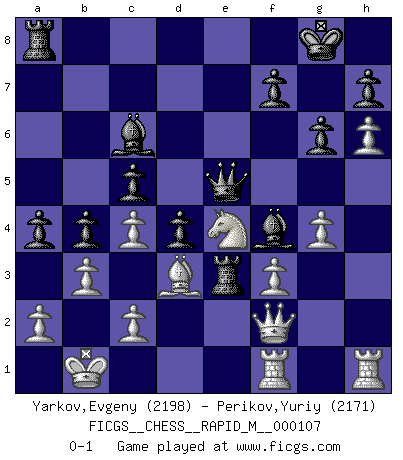 Last move : 0-1 2019 September 15 4:23:13 [Event "FICGS__CHESS__RAPID_M__000107"] [Site "FICGS"] [Date "2019.07.14"] [Round "1"] [White "Yarkov,Evgeny"] [Black "Perikov,Yuriy"] [Result "0-1"] [WhiteElo "2198"] [BlackElo "2171"] 1.e4 e5 2.Nf3 Nf6 3.Nxe5 d6 4.Nf3 Nxe4 5.Nc3 Nxc3 6.dxc3 Be7 7.Be3 O-O 8.Qd2 Nd7 9.O-O-O c6 10.Kb1 d5 11.h4 Bc5 12.Nd4 Re8 13.h5 Bf8 14.h6 g6 15.c4 c5 16.Nf3 d4 17.Bf4 Nf6 18.Ng5 Bf5 19.f3 Nh5 20.g4 Nxf4 21.Qxf4 Bd6 22.Qd2 Bd7 23.Bd3 Re3 24.Ne4 Bf4 25.Qf2 Bc6 26.Nd2 Rb8 27.Be4 Qe7 28.Qg2 Qe5 29.Qf2 Bd7 30.Bd3 a6 31.Qf1 b5 32.b3 b4 33.Qg2 Bc6 34.Ne4 a5 35.Rdf1 a4 36.Qf2 Ra8 0-1 Petrov : Nimzovich attack Kingside Castling by player Black (move 7) Queenside Castling by player White (move 9) Player Black won this chess game. Follow this game move after move (download)I like to say that Bobby Fischer was the greatest player ever. But what made Fischer a genius was his ability to blend an American freshness and pragmatism with Russian ideas about strategy. (Bruce Pandolfini) Kasparov ist eine Art Monster mit hundert Augen, denen auch nicht das Geringste entgeht. (Tony Miles) Una de estas pequeñas movidas modestas pudieran ser mas molestas a tu oponente que la amenaza mas grande. (Siegbert Tarrasch) Le système Elo représente seulement une moyenne. Il est simplement un indicateur de votre stabilité. (Anatoli Karpov) Life is the sum of all your choices. (Albert Camus)