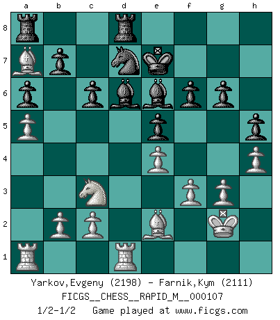 Last move : 1/2-1/2 2019 August 21 15:23:39 [Event "FICGS__CHESS__RAPID_M__000107"] [Site "FICGS"] [Date "2019.07.14"] [Round "1"] [White "Yarkov,Evgeny"] [Black "Farnik,Kym"] [Result "1/2-1/2"] [WhiteElo "2198"] [BlackElo "2111"] 1.e4 c5 2.Nf3 Nc6 3.d4 cxd4 4.Nxd4 Nf6 5.Nc3 a6 6.Nxc6 dxc6 7.Qxd8+ Kxd8 8.Bf4 Ke8 9.a4 Nd7 10.a5 e5 11.Be3 Nf6 12.Bc4 Bb4 13.f3 Ke7 14.Kf2 Be6 15.Be2 Nd7 16.g3 g6 17.Rhd1 Rhd8 18.Ra4 Bd6 19.h4 f6 20.Kg2 Rab8 21.R4a1 h5 22.Ba7 Ra8 1/2-1/2 Sicilian defense This chess game ended in a draw. Follow this game move after move (download)Who is your opponent tonight, tonight I am playing against the Black pieces. (Akiba Rubinstein) Im Internet Chess Club betrug mein Rating vorübergehend 3350 ELO-Punkte. (Sergej Karjakin) De eso se trata el Ajedrez. Un día le das una lección a tu oponente y al día siguiente el te da una a tí. (Bobby Fischer) Avec des compensations pour le matériel en plus... (Anonyme) I don't know, I don't care, and it doesn't make any difference. (Albert Einstein)