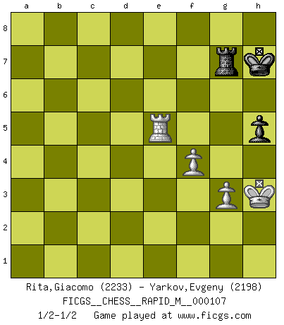 Last move : 1/2-1/2 2019 October 23 22:52:10 [Event "FICGS__CHESS__RAPID_M__000107"] [Site "FICGS"] [Date "2019.07.14"] [Round "1"] [White "Rita,Giacomo"] [Black "Yarkov,Evgeny"] [Result "1/2-1/2"] [WhiteElo "2233"] [BlackElo "2198"] 1.e4 c5 2.Nf3 Nc6 3.d4 cxd4 4.Nxd4 Nf6 5.Nc3 e5 6.Ndb5 d6 7.Bg5 a6 8.Na3 b5 9.Nd5 Be7 10.Bxf6 Bxf6 11.c3 O-O 12.Nc2 Bg5 13.a4 bxa4 14.Rxa4 a5 15.Bc4 Rb8 16.b3 Kh8 17.Nce3 Ne7 18.Nxe7 Qxe7 19.Nd5 Qd8 20.O-O f5 21.exf5 Bxf5 22.Qe2 Bd7 23.Ra2 Be6 24.Rd1 Rc8 25.g3 Rb8 26.h4 Bxh4 27.Ne3 Bxc4 28.Nxc4 Be7 29.Rxa5 Rxb3 30.Rxe5 Rxc3 31.Rxe7 Rxc4 32.Rxg7 Kxg7 33.Qxc4 Qe7 34.Qg4+ Kh8 35.Qb4 Qe2 36.Qd4+ Qe5 37.Qxd6 Qxd6 38.Rxd6 Kg7 39.Kg2 h5 40.Rd4 Kg6 41.f4 Kh6 42.Kh3 Rg8 43.Rd6+ Kh7 44.Re6 Kg7 45.Re5 Kh6 46.Rb5 Rg4 47.Rb6+ Kg7 48.Rd6 Kh7 49.Ra6 Rg8 50.Ra5 Kh6 51.Rf5 Rg4 52.Rf6+ Kh7 53.Re6 Rg7 54.Re5 1/2-1/2 Sicilian : Pelikan (Lasker/Sveshnikov) variation Kingside Castling by player Black (move 11) Kingside Castling by player White (move 20) 10 pieces endgame at move 33 : White KQRPP , Black KQRPP WHITE : King + 1 Queen 1 Rook 2 Pawns BLACK : King + 1 Queen 1 Rook 2 Pawns 9 pieces endgame at move 37 : White KQRPP , Black KQRP WHITE : King + 1 Queen 1 Rook 2 Pawns BLACK : King + 1 Queen 1 Rook 1 Pawn 8 pieces endgame at move 37 : White KRPP , Black KQRP WHITE : King + 1 Rook 2 Pawns BLACK : King + 1 Queen 1 Rook 1 Pawn 7 pieces endgame at move 38 : White KRPP , Black KRP WHITE : King + 1 Rook 2 Pawns BLACK : King + 1 Rook 1 Pawn This chess game ended in a draw. Follow this game move after move (download)We must make sure that Chess will not be like a dead language, very interesting, but for a very small group. (Sytze Faber) Vielleicht wirkt die Aura früherer Spieler glanzvoller als die der heutigen Spieler, aber das liegt daran, dass man kein Programm wie Fritz hatte, das einem all die Löcher in ihren Partien zeigt. (Vladimir Kramnik) Puntos débiles o agujeros en la posición de tu oponente deben de ser ocupados por piezas, no Peones. (Siegbert Tarrasch) Les erreurs sont comme les malheurs, elles n'arrivent jamais seules. (Siegbert Tarrasch) If you have any trouble condescending, find a Unix user to show you how it's done. (Scott Adams)
