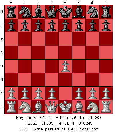 Last move : 1-0 2019 August 14 3:5:54 [Event "FICGS__CHESS__RAPID_A__000243"] [Site "FICGS"] [Date "2019.07.14"] [Round "1"] [White "Mag,James"] [Black "Perez,Ardee"] [Result "1-0"] [WhiteElo "2124"] [BlackElo "1900"] 1.e4 1-0 This chess game has been lost on time (started : 2019.07.14 13:39:38) King's pawn Opening Player White won this chess game. Follow this game move after move (download)Chess is a foolish expedient for making idle people believe they are doing something very clever when they are only wasting their time. (George Bernard Shaw) Wer wird heute Abend ihr Gegner sein? -- Heute Abend spiele ich gegen die schwarzen Steine. (Akiba Rubinstein) El Ajedrez es tortura mental. (Garry Kasparov) La vie et les Echecs sont tous les deux une lutte constante. (Lasker) I think your argument is specious - I think your tie is ugly. (Gregory House to Dr. Foreman, House M.D.)
