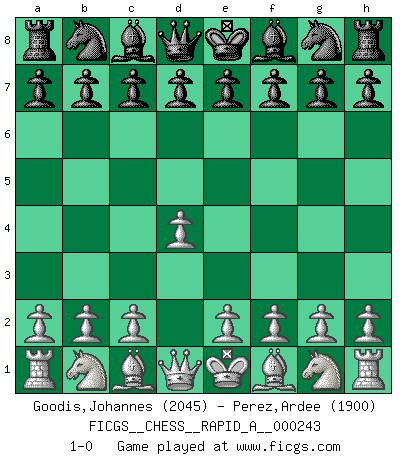 Last move : 1-0 2019 August 14 15:32:16 [Event "FICGS__CHESS__RAPID_A__000243"] [Site "FICGS"] [Date "2019.07.14"] [Round "1"] [White "Goodis,Johannes"] [Black "Perez,Ardee"] [Result "1-0"] [WhiteElo "2045"] [BlackElo "1900"] 1.d4 1-0 This chess game has been lost on time (started : 2019.07.14 13:39:38) Queen's pawn Player White won this chess game. Follow this game move after move (download)Chess is above all, a fight ! (Emanuel Lasker) Man kann eine Schachpartie nur gewinnen, wenn das Gleichgewicht gestört ist. In einer Stellung mit ungestörtem Gleichgewicht ist auch das größte Genie hilflos - in der Stellung steckt dann eben kein genialer Einfall. (Wilhelm Steinitz) Yo siempre he tenido un ligero sentimiento de lástima por una persona que no tiene conocimiento del Ajedrez. (Siegbert Tarrasch) Lorsque vous vous retrouvez devant une position atroce, ne tendez pas un ultime piège dérisoire avec l'intention d'abandonner si l'adversaire le déjoue ! Faites-vous plutôt un devoir de résister comme si votre vie en dépendait. Jouez le coup qui vous déplairait au centuple si vous étiez dans la peau de votre tortionnaire ! Remember : Your focus determines your reality. (Qui-Gon Jinn in Star Wars ep.1)