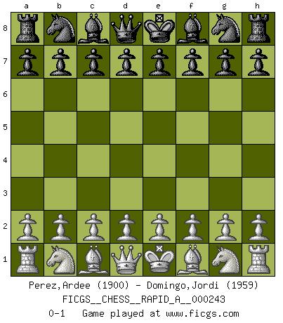 Last move : 0-1 2019 August 14 3:5:54 [Event "FICGS__CHESS__RAPID_A__000243"] [Site "FICGS"] [Date "2019.07.14"] [Round "1"] [White "Perez,Ardee"] [Black "Domingo,Jordi"] [Result "0-1"] [WhiteElo "1900"] [BlackElo "1959"] 0-1 This chess game has been lost on time (started : 2019.07.14 13:39:38) Player Black won this chess game. Follow this game move after move (download)The Pawns are the soul of the game. (Francois Andre Danican Philidor) Sicherlich können nur Meister einen Stil haben. Daß ein nicht-Meister auch nur ein einziges Mal in seinem Leben eine Partie folgerecht durchführte, habe ich niemals bemerkt. (Emanuel Lasker) Muchos jugadores de Ajedrez se sorprendían cuando después de la partida, Fischer explicaba con calma: 'Yo ya había analizado esta posibilidad' en una posición en la cual yo creía que no era posible de prever desde la apertura. (Mikhail Tal) Psychologiquement, tu dois avoir confiance en toi même, mais cette confiance doit être basée sur des faits. (Robert Fischer) Perhaps chess is the wrong game for the times (The Chess Master and the Computer, by Garry Kasparov - 2010)