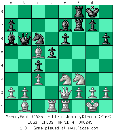 Last move : 1-0 2019 August 7 16:19:43 [Event "FICGS__CHESS__RAPID_A__000243"] [Site "FICGS"] [Date "2019.07.14"] [Round "1"] [White "Maron,Paul"] [Black "Cleto Junior,Dirceu"] [Result "1-0"] [WhiteElo "1935"] [BlackElo "2162"] 1.d4 Nf6 2.Nf3 e6 3.e3 d5 4.Bd3 c5 5.c3 Nc6 6.O-O b6 7.Nbd2 Bb7 8.Re1 Be7 9.dxc5 bxc5 10.e4 O-O 11.e5 Nd7 12.Nf1 Qb6 13.Qc2 h6 14.Qe2 f6 15.exf6 Rxf6 16.Bf4 c4 17.Bc2 Nc5 18.Bg3 Rf7 19.Ne3 Raf8 20.Rad1 Bd8 21.Bb1 Ba6 22.Bd6 Be7 23.Bxc5 1-0 Queen's pawn : Yusupov-Rubinstein system Kingside Castling by player White (move 6) Kingside Castling by player Black (move 10) Player White won this chess game. Follow this game move after move (download)It is always better to sacrifice your opponent's men. (Savielly Tartakower) Ich war zu klein für die Schach-Schülermannschaft! (Woody Allen) Nada excita más a Grandes Maestros aburridos que una novedad teórica. (Dominic Lawson) Le succès, c'est être capable d'aller d'échec en échec sans perdre son enthousiasme. (Winston Churchill) The difference between perseverance and obstinacy is that one comes from a strong will, and the other from a strong won't. (Henry Ward Beecher)