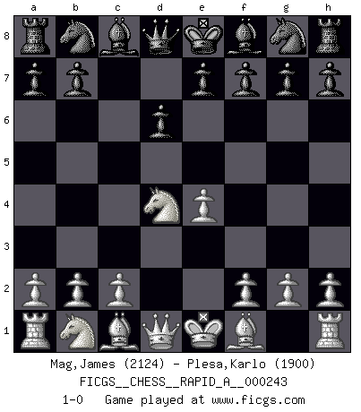 Last move : 1-0 2019 August 19 22:56:23 [Event "FICGS__CHESS__RAPID_A__000243"] [Site "FICGS"] [Date "2019.07.14"] [Round "1"] [White "Mag,James"] [Black "Plesa,Karlo"] [Result "1-0"] [WhiteElo "2124"] [BlackElo "1900"] 1.e4 c5 2.Nf3 d6 3.d4 cxd4 4.Nxd4 1-0 This chess game has been lost on time (started : 2019.07.14 13:39:38) Sicilian Player White won this chess game. Follow this game move after move (download)Pawn endings are to Chess what putting is to golf. (Cecil Purdy) Ich weiss nicht was Gott gegen mich auf 1.e4 antworten würde. (Robert James Fischer) Debió haber existido una vez en que los hombres eran semidióses, de otra manera no hubiesen podido inventar el Ajedrez. (Gustav Schenk) Si le désir cupide (et stupide) de gagner est une inépuisable source de souffrance, une combinaison brillante sur l'échiquier est une découverte : le coquelicot qui s'épanouit lorsque apparaît la Voie Lactée. (Arrabal) It's not enough to succeed. Others must fail. (Gore Vidal)