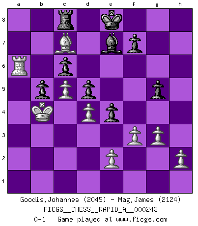 Last move : 0-1 2019 October 28 11:54:40 [Event "FICGS__CHESS__RAPID_A__000243"] [Site "FICGS"] [Date "2019.07.14"] [Round "1"] [White "Goodis,Johannes"] [Black "Mag,James"] [Result "0-1"] [WhiteElo "2045"] [BlackElo "2124"] 1.d4 Nf6 2.Nf3 d5 3.g3 Bf5 4.Bg2 c6 5.c4 e6 6.Nc3 Nbd7 7.Qb3 Qb6 8.c5 Qxb3 9.axb3 a6 10.b4 Rd8 11.Nh4 Bc2 12.Kd2 Bf5 13.b5 axb5 14.Nxf5 exf5 15.Ra7 b6 16.b4 Be7 17.Bb2 h5 18.Rha1 Ne4+ 19.Bxe4 fxe4 20.Rc7 Rh6 21.R1a7 h4 22.Kc2 Re6 23.Nd1 g6 24.Bc1 bxc5 25.bxc5 h3 26.Be3 Bf6 27.Kb3 Re7 28.Kb4 Nb8 29.Rxe7+ Bxe7 30.f3 Rd7 31.Ra8 Rd8 32.Nf2 Nd7 33.Ra7 Nf8 34.Nxh3 Ne6 35.Nf4 Nxf4 36.Bxf4 Rd7 37.Ra8+ Rd8 38.Ra6 g5 39.Bc7 Rc8 0-1 This chess game has been lost on time (started : 2019.07.14 13:39:38) Queen's pawn game Player Black won this chess game. Follow this game move after move (download)When you don't know what to do, wait for your opponent to get an idea - it's sure to be wrong. (Tarrasch) Smyslow ist ein Beweis dafür, dass ich noch zehn Jahre spielen kann! [der 75 jährige über den 85 jährigen] (Viktor Kortschnoi) En el tablero, la mentira e hipocresía no sobreviven mucho. (Emanuel Lasker) Fischer est le meilleur joueur du monde et Karpov n'est qu'un joueur de bistrot. (Garry Kasparov, agé de 16 ans) I find television to be very educating. Every time somebody turns on the set, I go in the other room and read a book. (Groucho Marx)
