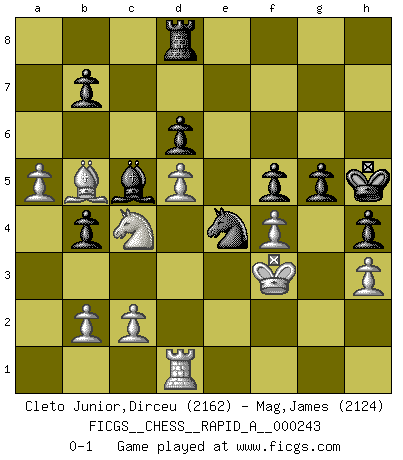 Last move : 0-1 2019 October 5 14:59:56 [Event "FICGS__CHESS__RAPID_A__000243"] [Site "FICGS"] [Date "2019.07.14"] [Round "1"] [White "Cleto Junior,Dirceu"] [Black "Mag,James"] [Result "0-1"] [WhiteElo "2162"] [BlackElo "2124"] 1.e4 c5 2.Nf3 d6 3.d4 cxd4 4.Nxd4 Nf6 5.Nc3 a6 6.Be2 e5 7.Nb3 Be7 8.O-O O-O 9.Qd3 Be6 10.Bd2 Nc6 11.Nd5 a5 12.a4 Bxd5 13.exd5 Nb4 14.Bxb4 axb4 15.a5 Qd7 16.Nd2 Qc7 17.Nc4 Qc5 18.g3 g6 19.Qe3 Nd7 20.Qxc5 Nxc5 21.Nb6 Rab8 22.Bb5 Rbd8 23.Kg2 Bf6 24.Nc4 h5 25.Rae1 Bg7 26.f4 exf4 27.gxf4 f5 28.Re2 Bf6 29.Ra1 Kg7 30.Kf3 Kh6 31.h3 Rf7 32.Re8 Rxe8 33.Bxe8 Rf8 34.Bb5 Rd8 35.Ke2 Bd4 36.Rd1 Bf6 37.Ra1 Kh7 38.Ke3 Kg7 39.Kf3 h4 40.Ke2 Kh6 41.Ke3 Kh5 42.Kf3 Kh6 43.Ke3 Kh5 44.Kf3 Bg7 45.Ke2 Bd4 46.Rd1 Bh8 47.Ke3 Ne4 48.Ra1 Bg7 49.Kf3 g5 50.Re1 Bd4 51.Rd1 Bc5 0-1 Sicilian : Najdorf, Opovcensky variation Kingside Castling by player White (move 8) Kingside Castling by player Black (move 8) Player Black won this chess game. Follow this game move after move (download)A passed Pawn increases in strength as the number of pieces on the board diminishes. (Capablanca) Dass jemand wie Surab Asmaiparaschwili, der selbst Elopunkte gekauft hat , Vize-Präsident der Fide werden konnte, sagt schon einges über den Zustand dieser Organisation aus. (Joel Lautier) Vive, pierde y aprende al observar a tu oponente como gana. (Amber Steenbock) Aucun coup ne doit être joué sans but. (Pedro Damiano) Beta. Software undergoes beta testing shortly before it's released. Beta is latin for still doesn't work. (Anonymous)