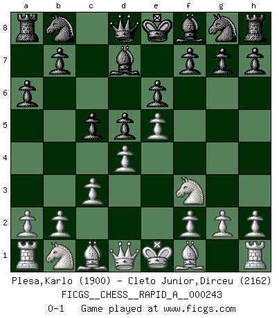 Last move : 0-1 2019 August 19 22:56:23 [Event "FICGS__CHESS__RAPID_A__000243"] [Site "FICGS"] [Date "2019.07.14"] [Round "1"] [White "Plesa,Karlo"] [Black "Cleto Junior,Dirceu"] [Result "0-1"] [WhiteElo "1900"] [BlackElo "2162"] 1.e4 e6 2.d4 d5 3.e5 c5 4.c3 Bd7 5.Nf3 a6 0-1 This chess game has been lost on time (started : 2019.07.14 13:39:38) French : Advance variation Player Black won this chess game. Follow this game move after move (download)The most powerful weapon in Chess is to have the next move. (David Bronstein) Ja, ich habe einmal eine Blitzpartie gespielt, es war in einem Zug, 1929. --im Interview 1989 (Mikhail Moiseyevich Botvinik) Dejen al perfeccionista jugar por correo. (Yasser Seirawan) Vous m'avez demandé de vous exposer quel est le fondement de la prière. Je ne fais que préparer les pièces du jeu sur la table... Nous sera-t-il permis d'en adopter les règles et si nous les appliquons scrupuleusement nous ne tarderons pas à faire mat le Roi divin ! Il ne pourra échapper à nos mains. (Sainte Thérèse d'Avila, Chemin de perfection) Coffee just isn't my cup of tea. (Unknown)