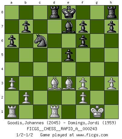 Last move : 1/2-1/2 2019 September 23 18:11:53 [Event "FICGS__CHESS__RAPID_A__000243"] [Site "FICGS"] [Date "2019.07.14"] [Round "1"] [White "Goodis,Johannes"] [Black "Domingo,Jordi"] [Result "1/2-1/2"] [WhiteElo "2045"] [BlackElo "1959"] 1.d4 d5 2.Nf3 c5 3.c4 dxc4 4.e4 cxd4 5.Qxd4 Qxd4 6.Nxd4 a6 7.Bxc4 e5 8.Nf3 Nc6 9.Nc3 Nf6 10.O-O Bg4 11.Be3 Rc8 12.Rfd1 Bb4 13.Nd5 Nxe4 14.h3 Bxf3 15.gxf3 Nf6 16.Nxf6+ gxf6 17.a3 Be7 18.Bd3 Rd8 1/2-1/2 Queen's pawn game, Krause variation Kingside Castling by player White (move 10) This chess game ended in a draw. Follow this game move after move (download)Chess is played with the mind and not with the hands ! (Renaud and Kahn) Wer mein Gambit spielt, muß bereit sein, alle Brücken hinter sich abzubrechen. Es verändert den ganzen Menschen. Es wirkt wie ein Zauberstab und fördert verkümmerte, gute Charakter- eigenschaften wieder zu Tage. (Emil Joseph Diemer) Realmente no sabemos como el juego fue inventado, aunque hay sospechas. Tan pronto como descubramos a los culpables, se los haremos saber. (Bruce Pandolfini) Aux échecs, les retours au sommet sont rares : les dommages psychologiques consécutifs à une défaite sont trop sévères. (Daily Telegraph) They say in chess you've got to kill the queen, and then you mate it... Oh I, do you ? (Red Hot Chili Peppers, Fortune faded)