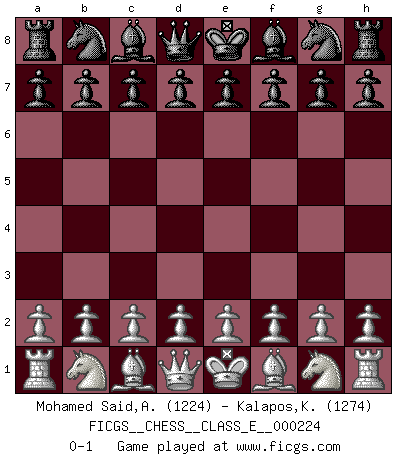 Last move : 0-1 2019 August 28 14:30:12 [Event "FICGS__CHESS__CLASS_E__000224"] [Site "FICGS"] [Date "2019.07.19"] [Round "1"] [White "Mohamed Said,Azaim"] [Black "Kalapos,Karol"] [Result "0-1"] [WhiteElo "1224"] [BlackElo "1274"] 0-1 This chess game has been lost on time (started : 2019.07.19 11:33:23) Player Black won this chess game. Follow this game move after move (download)Personally, I rather look forward to a computer program winning the world Chess Championship. Humanity needs a lesson in humility. (Richard Dawkings) Unter Putin wird alles Geld aus Russland wie von einem Staubsauger nach Moskau umgeleitet, das ist wie ein schwarzes Loch. (Garry Kasparov) Alguna parte de un error es siempre correcto. (Savielly Tartakover) Les Echecs ont trois composantes : le temps, l'espace et le matériel en dernier. (Mikhail Tal) Fear is the path to the dark side. Fear leads to anger; anger leads to hate; hate leads to suffering. I sense much fear in you. (Master Yoda in Star Wars ep.1)