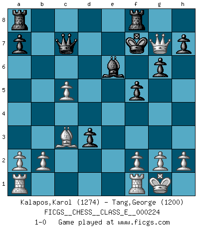 Last move : 1-0 2019 August 10 10:41:0 [Event "FICGS__CHESS__CLASS_E__000224"] [Site "FICGS"] [Date "2019.07.19"] [Round "1"] [White "Kalapos,Karol"] [Black "Tang,George"] [Result "1-0"] [WhiteElo "1274"] [BlackElo "1200"] 1.d4 d5 2.c4 e5 3.e3 exd4 4.exd4 Be6 5.Nd2 Bb4 6.c5 c6 7.Qb3 Ba5 8.Qxb7 Nd7 9.Qxc6 Ne7 10.Qa4 Bxd2+ 11.Bxd2 O-O 12.Nf3 Qc7 13.Qc2 Nc6 14.Bd3 Nf6 15.O-O g6 16.Ng5 Nxd4 17.Qc3 Ne4 18.Nxe4 dxe4 19.Qxd4 exd3 20.Bc3 f5 21.Qh8+ Kf7 22.Qg7+ 1-0 QGD : Albin counter-gambit Kingside Castling by player Black (move 11) Kingside Castling by player White (move 15) Player White won this chess game. Follow this game move after move (download)Good positions don't win games, good moves do. (Gerald Abrahams) Modernes Schach erfordert enorme Anspannung. Es ist für einen normalen Menschen unmöglich das auszuhalten. (Viktor Kortschnoi) El juego de Damas es para vagabundos. (Paul Morphy) Je crois qu'il existe des manières très spécifiques de jouer efficacement contre une machine. Evidemment, nous n'avons aucune chance en technique pure, parce que l'ordinateur calcule de manière parfaite. Mais lorsque nous faisons appel à notre cerveau, en utilisant l'intuition et la compréhension, alors nous restons beaucoup plus forts. (Anatoli Karpov) CHESS, n. f. [echecs, Fr.] A nice and abstruse game, in which two sets of puppets are moved in opposition to each other. (Dr Samuel Johnson, A Dictionary Of The English Language, 1755)