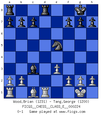 Last move : 0-1 2019 August 6 4:10:10 [Event "FICGS__CHESS__CLASS_E__000224"] [Site "FICGS"] [Date "2019.07.19"] [Round "1"] [White "Wood,Brian"] [Black "Tang,George"] [Result "0-1"] [WhiteElo "1231"] [BlackElo "1200"] 1.d4 d5 2.c4 e5 3.dxe5 Be6 4.cxd5 Bxd5 5.Nc3 Bb4 6.Nf3 Ne7 7.e3 O-O 8.Be2 Bxf3 9.Qxd8 Rxd8 10.Bxf3 Nbc6 11.Bxc6 Nxc6 12.O-O Nxe5 13.Rd1 Bxc3 0-1 QGD : Albin counter-gambit Kingside Castling by player Black (move 7) Kingside Castling by player White (move 12) Player Black won this chess game. Follow this game move after move (download)Up to this point White has been following well-known analysis. But now he makes a fatal error: he begins to use his own head. (Siegbert Tarrasch) Wir irren allesamt, nur jeder irrt anders. (Georg Christoph Lichtenberg) Un jugador que es sorprendido, esta derrotado a medias. (Proverbio) Comme les marins qui ont mille raisons différentes d'aller en mer, les joueurs d'échecs en ont tout autant avant de s'installer devant une table et jouer... (Vincent Bertignac, philosophe) Good decisions come from experience, and experience comes from bad decisions. (Anonymous)