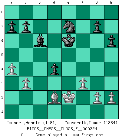 Last move : 0-1 2019 August 13 16:16:41 [Event "FICGS__CHESS__CLASS_E__000224"] [Site "FICGS"] [Date "2019.07.19"] [Round "1"] [White "Joubert,Hennie"] [Black "Zaunercik,Ilmar"] [Result "0-1"] [WhiteElo "1481"] [BlackElo "1234"] 1.e4 e5 2.Nf3 Nc6 3.Bc4 Bc5 4.d4 exd4 5.c3 dxc3 6.Bxf7+ Kxf7 7.Qd5+ Ke8 8.Qxc5 Nf6 9.Nxc3 d6 10.Qc4 Bg4 11.Ng5 Qe7 12.O-O h6 13.Nd5 Nxd5 14.exd5 Be2 15.Re1 Bxc4 16.Rxe7+ Nxe7 17.Ne6 Bxd5 18.Nxc7+ Kd7 19.Nxa8 Rxa8 20.Be3 Nf5 21.Bf4 Re8 22.b3 Re2 23.Kf1 Rc2 24.Rd1 Ne7 25.Rd2 Rxd2 26.Bxd2 Ke6 27.f3 Bc6 28.Ke2 d5 29.a4 d4 0-1 Giuoco Piano Kingside Castling by player White (move 12) Player Black won this chess game. Follow this game move after move (download)The hallmark of the artist is simplicity. (Larry Evans) Das Schach ist nichts für kleine Geister, es beansprucht einen vollen Mann, der sich nicht sklavisch an das Überlieferte hält, sondern selbständig die Tiefen des Spiels zu ergründen sucht. (Wilhelm Steinitz) La batalla por la última verdad nunca sera ganada. Y es por eso que el Ajedrez es tan fascinante. (Hans Kmoch) J'apprécie les joueurs d'est-indienne, c'est grâce à eux que je nourris ma famille depuis tant d'années. (Petrosian) I just play for fun. (Anna Kournikova)