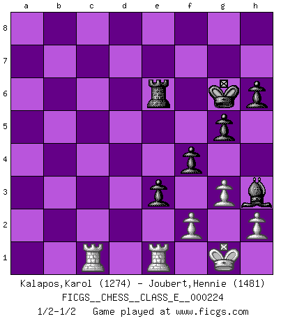 Last move : 1/2-1/2 2019 August 20 13:41:57 [Event "FICGS__CHESS__CLASS_E__000224"] [Site "FICGS"] [Date "2019.07.19"] [Round "1"] [White "Kalapos,Karol"] [Black "Joubert,Hennie"] [Result "1/2-1/2"] [WhiteElo "1274"] [BlackElo "1481"] 1.d4 Nf6 2.c4 g6 3.g3 Bg7 4.Bg2 O-O 5.Nc3 d6 6.Bg5 c6 7.e3 Qc7 8.Nge2 h6 9.Bxf6 Bxf6 10.O-O Nd7 11.Qc2 e5 12.Rfd1 exd4 13.exd4 Bg7 14.Rd3 Nf6 15.Re3 Bf5 16.Be4 Nxe4 17.Nxe4 d5 18.cxd5 Rac8 19.Rc1 Qd7 20.Nc5 Qxd5 21.Qd2 b6 22.Nb3 g5 23.Nc3 Qd7 24.a4 Bh3 25.Re4 f5 26.Re2 b5 27.Nc5 Qd6 28.Re6 Qd8 29.d5 Bxc3 30.Qxc3 Kh7 31.Qe5 Rf7 32.Re1 Qxd5 33.Qxd5 cxd5 34.b4 bxa4 35.Nxa4 Rb8 36.Rb1 Rfb7 37.Nc5 Rxb4 38.Re7+ Kg6 39.Rbe1 Re4 40.Nxe4 dxe4 41.Rxa7 Rb6 42.Rc7 Re6 43.Rc3 f4 44.Rc4 e3 45.R4c1 1/2-1/2 King's Indian : 3.g3 Kingside Castling by player Black (move 4) Kingside Castling by player White (move 10) This chess game ended in a draw. Follow this game move after move (download)I played Chess with him and would have beaten him sometimes only he always took back his last move, and ran the game out differently. (Mark Twain) Im Schach nämlich geht es darum, daß Ich des Gegners klein zu kriegen, sein Ego zu zerbrechen und zu zermahlen, seine Selbstachtung zu zertreten und zu verscharren und seine ganze mißachtenswerte sogenannte Persönlichkeit ein für alle Mal tot zu hacken und zu zerstampfen und dadurch die menschliche Gesellschaft von einer stinkenden Pestbeule zu befreien. Es ist ein königliches Spiel. (Robert James Fischer) ¿Porque tengo que perder ante este idiota?. (Aron Nimzovich) La conception d'un plan est le processus par lequel un joueur exploite les avantages de sa position tout en s'efforçant d'en réduire au minimum les inconvénients. Afin de garantir le succès, un plan doit toujours se fonder sur un diagnostic objectif des particularités d'une position. La conception d'un plan est d'autant plus difficile que la position est équilibrée, et grandement facilitée lorsqu'il n'existe qu'un seul plan susceptible de répondre aux exigences de la position. (Harry Golombek) The real danger is not that computers will begin to think like men, but that men will begin to think like computers. (Sydney J. Harris)