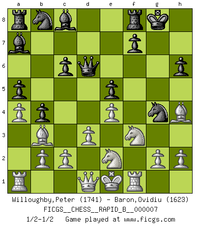 Last move : 1/2-1/2 2006 July 11 11:43:8 [Event "FICGS__CHESS__RAPID_B__000007"] [Site "FICGS"] [Date "2006.06.14"] [Round "1"] [White "Willoughby,Peter"] [Black "Baron,Ovidiu"] [Result "1/2-1/2"] [WhiteElo "1741"] [BlackElo "1623"] 1.e4 e5 2.f4 Bc5 3.Nf3 d6 4.Nc3 Nf6 5.Bc4 c6 6.fxe5 dxe5 7.d3 Qe7 8.Bg5 b5 9.Bb3 a5 10.a4 b4 11.Ne2 O-O 12.Rf1 h6 13.Bh4 g5 14.Nxg5 Ng4 15.Nf3 Qd6 16.Qd2 Be3 17.Qd1 Ba7 1/2-1/2 KGD : Classical variation Kingside Castling by player Black (move 11) This chess game ended in a draw. Follow this game move after move (download)Best by test: 1. e4 (Bobby Fischer) Ein unbeabsichtigtes Patt ist der Gipfel der Dummheit. (Anonymous) Cuando la partida de Ajedrez termina, el Peón y el Rey regresan a la misma caja. (Irish saying) Il a essayé de se convaincre qu'il pourrait empêcher toutes les erreurs et ne jamais perdre. L'horreur ! Gary Kasparov au sujet de Robert Fischer. Don't be discouraged. It's often the last key in the bunch that opens the lock. (Author unknown)