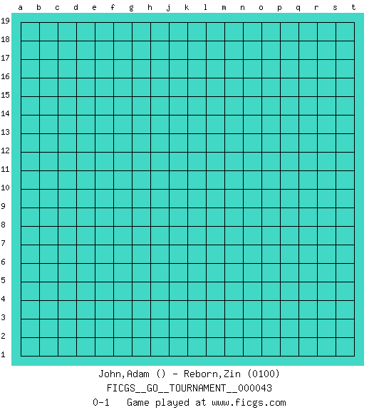 Last move : 0-1 2019 August 19 10:45:47 [Event "FICGS__GO__TOURNAMENT__000043"] [Site "FICGS"] [Date "2019.07.19"] [Round "1"] [Black "John,Adam"] [White "Reborn,Zin"] [Result "0-1"] [Rating 2 "0100"] 0-1 This go game has been lost on time (started : 2019.07.19 22:27:42) Here are the names of the openings (joseki) played in the four corners : Player White won this Go (weiqi, baduk) game. Follow this game move after move (download)There are players who don't accept exchange: they play many moves that perpetuate a previous state of the game. (Pierre Audouard) Luck never gives; it only lends. (Swedish proverb)