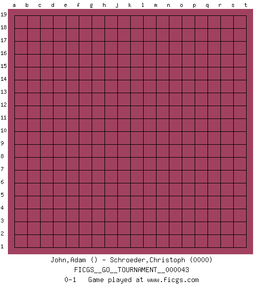 Last move : 0-1 2019 August 19 10:45:47 [Event "FICGS__GO__TOURNAMENT__000043"] [Site "FICGS"] [Date "2019.07.19"] [Round "1"] [Black "John,Adam"] [White "Schroeder,Christoph"] [Result "0-1"] [Rating 2 "0000"] 0-1 This go game has been lost on time (started : 2019.07.19 22:27:42) Here are the names of the openings (joseki) played in the four corners : Player White won this Go (weiqi, baduk) game. Follow this game move after move (download)Knight's moves win running battles. (Anonymous) For to win one hundred victories in one hundred battles is not the acme of skill. To subdue the enemy without fighting is the acme of skill. (Sun Tzu)