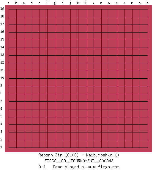 Last move : 0-1 2019 August 19 10:45:47 [Event "FICGS__GO__TOURNAMENT__000043"] [Site "FICGS"] [Date "2019.07.19"] [Round "1"] [Black "Reborn,Zin"] [White "Kaib,Yoshka"] [Result "0-1"] [Rating 1 "0100"] 0-1 This go game has been lost on time (started : 2019.07.19 22:27:42) Here are the names of the openings (joseki) played in the four corners : Player White won this Go (weiqi, baduk) game. Follow this game move after move (download)There is damezumari at the bamboo joint. (Anonymous) To steal ideas from one person is plagiarism. To steal from many is research. (Unknown)