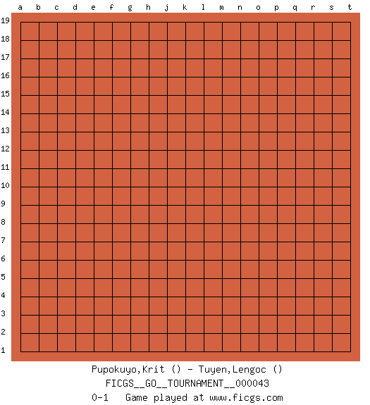 Last move : 0-1 2019 August 19 10:45:47 [Event "FICGS__GO__TOURNAMENT__000043"] [Site "FICGS"] [Date "2019.07.19"] [Round "1"] [Black "Pupokuyo,Krit"] [White "Tuyen,Lengoc"] [Result "0-1"] 0-1 This go game has been lost on time (started : 2019.07.19 22:27:42) Here are the names of the openings (joseki) played in the four corners : Player White won this Go (weiqi, baduk) game. Follow this game move after move (download)Learn the eye-stealing tesuji. (Anonymous) Art is not a thing, it is a way. (Elbert Hubbard)
